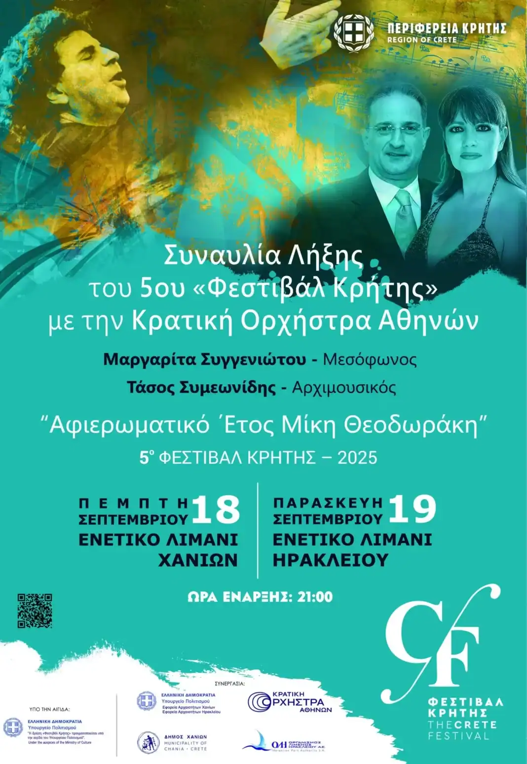 Το «Φεστιβάλ Κρήτης» της Περιφέρειας που αποτελεί ένα επιτυχημένο θεσμό στον Πολιτισμό τα τελευταία πέντε χρόνια στο νησί, ολοκληρώνει την φετινή του διοργάνωση με αφιέρωμα στον Παγκόσμιο Κρητικό Μίκη Θεοδωράκη, φιλοξενώντας την Κρατική Ορχήστρα Αθηνών. Με δύο δωρεάν στους πολίτες της Κρήτης συναυλίες με ενιαία ώρα έναρξης στις 9 μ.μ., την Πέμπτη 18 Σεπτεμβρίου στο Ενετικό λιμάνι Χανίων και την Παρασκευή 19 Σεπτεμβρίου στο Ενετικό λιμάνι Ηρακλείου, «πέφτει» η αυλαία του φεστιβάλ για το 2025.