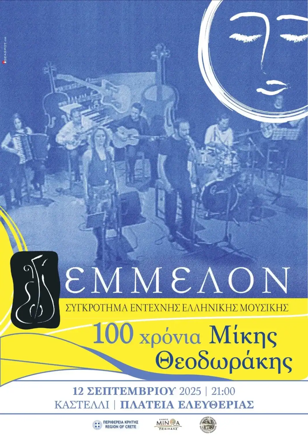 Με την υποστήριξη της Περιφέρειας Κρήτης και στο πλαίσιο των εκδηλώσεων για τα 100 χρόνια από τη γέννηση του μεγάλου Έλληνα μουσικό-συνθέτη Μίκη Θεοδωράκη, θα πραγματοποιηθεί μουσική εκδήλωση από το συγκρότημα ΕΜΜΕΛΟΝ, την Παρασκευή 12 Σεπτεμβρίου στις 9 το βράδυ στην πλ. Ελευθερίας στο Καστέλι Πεδιάδας με ελεύθερη είσοδο.
