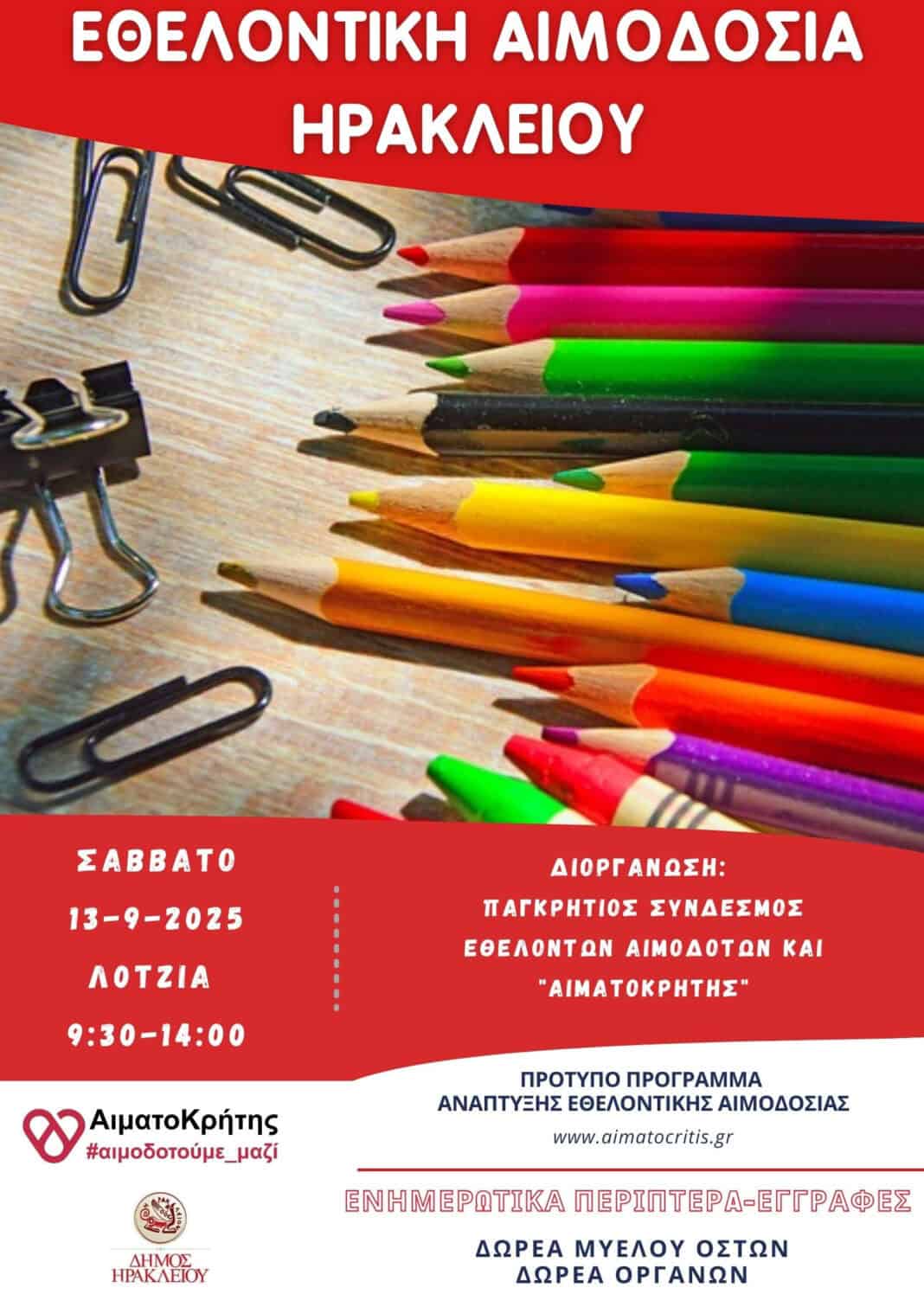 Πρόκειται για μια κοινή προσπάθεια αιμοδοσίας, την οποία διοργανώνει ο Παγκρήτιος Σύνδεσμος Εθελοντών Αιμοδοτών και Δωρητών Οργάνων Σώματος «Αιματοκρήτης» με τη στήριξη του Δήμου Ηρακλείου.