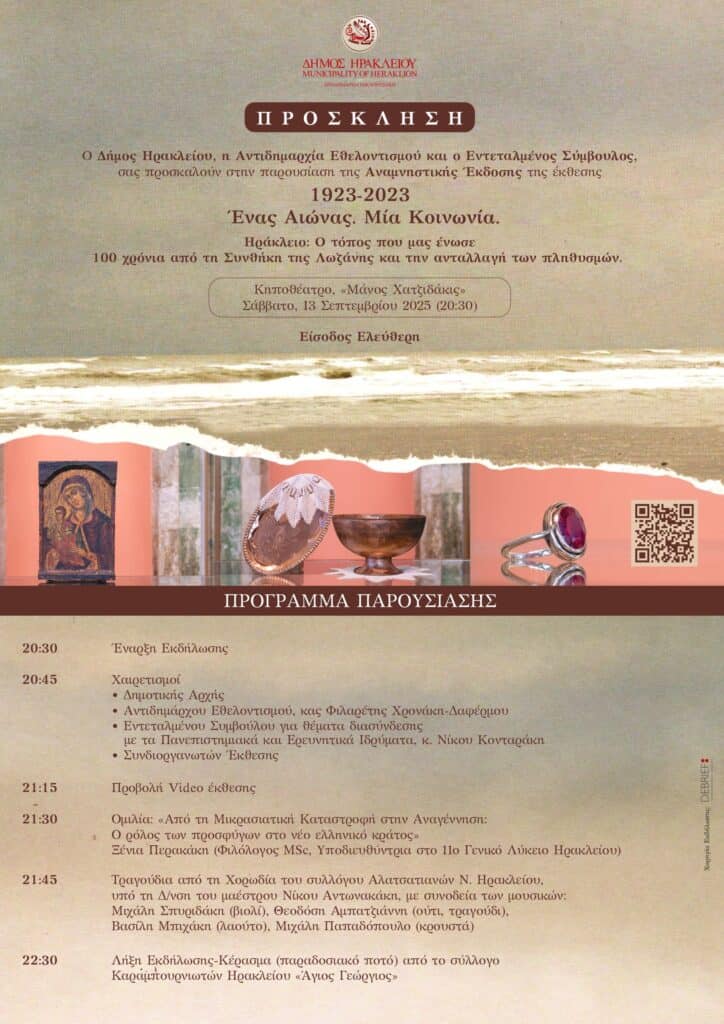 Εκδήλωση για την παρουσίαση της Αναμνηστικής Έκδοσης της έκθεσης κειμηλίων «1923-2023: ΕΝΑΣ ΑΙΩΝΑΣ. ΜΙΑ ΚΟΙΝΩΝΙΑ. ΗΡΑΚΛΕΙΟ: Ο τόπος που μας ένωσε» η οποία είχε πραγματοποιηθεί για τα 100 χρόνια από τη Συνθήκη της Λωζάνης και την ανταλλαγή των πληθυσμών, διοργανώνει ο Δήμος Ηρακλείου, η Αντιδημαρχία Εθελοντισμού και ο Εντεταλμένος Σύμβουλος για θέματα διασύνδεσης με τα Πανεπιστημιακά και Ερευνητικά Ιδρύματα Νίκος Κονταράκης, στο Κηποθέατρο «Μάνος Χατζιδάκις» το Σάββατο 13/9 στις 20:30 με ελεύθερη είσοδο για το κοινό.