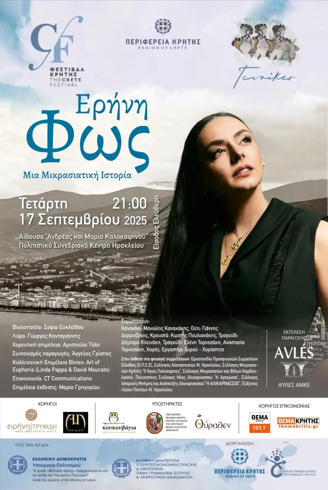 Στο πλαίσιο της παράλληλης δράσης του 5ου Φεστιβάλ Κρήτης «Γυναίκες», που υλοποιείται για 2η συνεχόμενη χρονιά, με την υποστήριξη του Αυτοτελούς Γραφείου Ισότητας της Περιφέρειας Κρήτης, παρουσιάζεται η συναυλία «Ερήνη – Φως: Μια Μικρασιατική Ιστορία», την Τετάρτη 17 Σεπτεμβρίου, στις 9:00μ.μ. (οι πόρτες ανοίγουν στις 8:00μ.μ.), στο Πολιτιστικό Συνεδριακό Κέντρο Ηρακλείου, στην Αίθουσα «Ανδρέας και Μαρία Καλοκαιρινού», με ελεύθερη είσοδο.