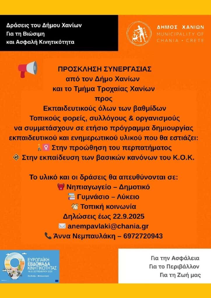 Τον σχεδιασμό και τον συντονισμό των δράσεων έχει αναλάβει η Άννα Νεμπαυλάκη. Οι δηλώσεις συμμετοχής θα γίνονται δεκτές έως τις 23/9/2025 στο email: anempavlaki@chania.gr και στο τηλ. 6972720943