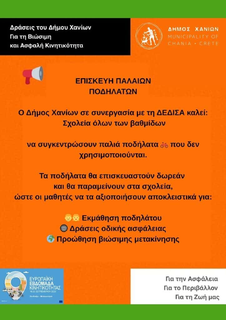 Στο πλαίσιο των δράσεων, τα σχολεία που θα συγκεντρώσουν παλιά ποδήλατα για χρήση στις σχολικές τους μονάδες, θα έχουν τη δυνατότητα να τα επισκευάσουν δωρεάν μέσω του Δήμου Χανίων και της ΔΕΔΙΣΑ, με δηλώσεις συμμετοχής έως τις 23/9/2025.
