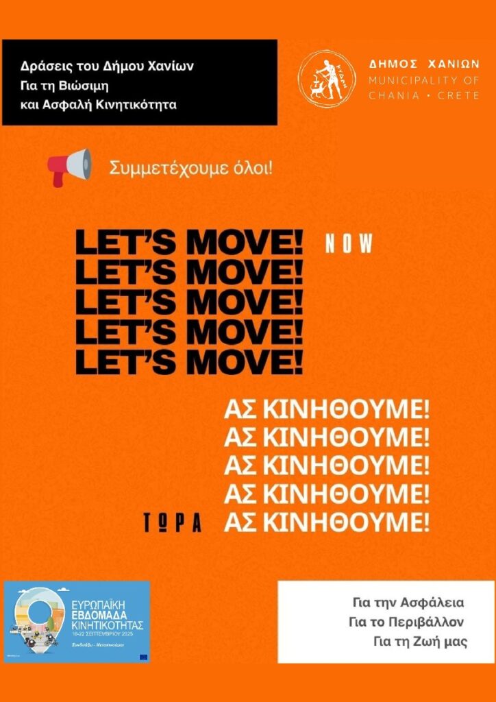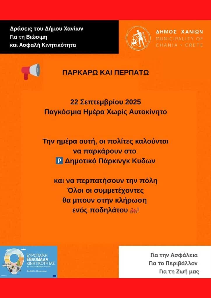 O Δήμος Χανίων με αφορμή την Ευρωπαϊκή Εβδομάδα Κινητικότητας, που φέτος φέρει το σύνθημα «Κινητικότητα για Όλους», διοργανώνει σειρά δράσεων που προάγουν το περπάτημα, την ποδηλασία και την υπεύθυνη οδήγηση, σύμφωνα με τον Κώδικα Οδικής Κυκλοφορίας (ΚΟΚ).