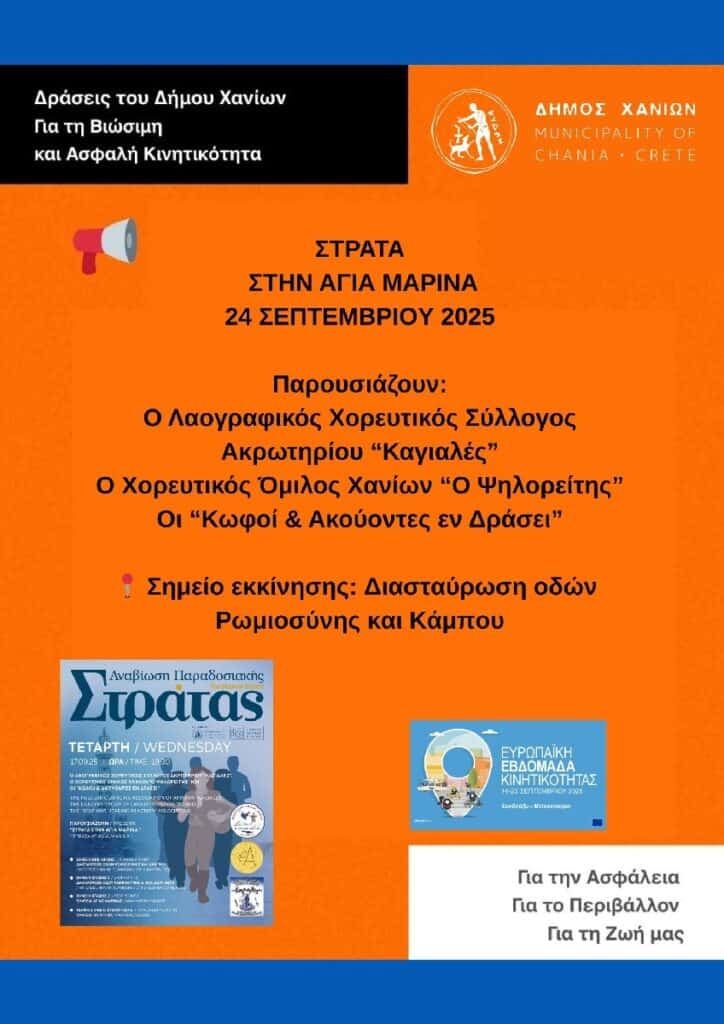 Την Τετάρτη 24 Σεπτεμβρίου, το Τμήμα Τουρισμού του Δήμου Χανίων, σε συνεργασία με τον Λαογραφικό Χορευτικό Σύλλογο Ακρωτηρίου «Καγιαλές», τον Χορευτικό Όμιλο Χανίων «Ο Ψηλορείτης» και την ομάδα «Κωφοί και Ακούοντες εν Δράσει», διοργανώνει την Παραδοσιακή Στράτα του Δήμου Χανίων, στην Αγιά Μαρίνα.