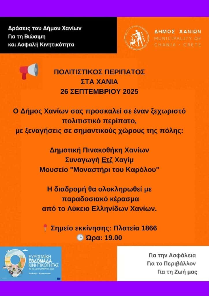 Τέλος, την Παρασκευή 26 Σεπτεμβρίου θα πραγματοποιηθεί πολιτιστικός περίπατος στην πόλη των Χανίων. Η εκκίνηση θα γίνει από την Πλατεία 1866 στις 18:30, θα ακολουθήσει στάση στο Μουσείο «Μοναστήρι του Καρόλου» στις 19:00 και στη Δημοτική Πινακοθήκη Χανίων στις 20:00, όπου και στους δύο χώρους θα πραγματοποιηθεί ξενάγηση.