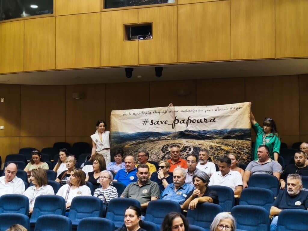 Με δυναμικό τρόπο και την ανάρτηση πανό με το σύνθημα «Save Papoura» μέλη της Επιτροπής Αγώνα, κάτοικοι, φορείς και εκπρόσωποι της Τοπικής Αυτοδιοίκησης, έκαναν για μια ακόμη φορά αισθητή την παρουσία τους, το πρωί της Πέμπτης, στο Επιμελητήριο Ηρακλείου, όπου διεξαγόταν η ημερίδα του Υπουργείου Πολιτισμού με θέμα «Καινοτομία και Παράδοση στη Σύγχρονη Χειροτεχνία».