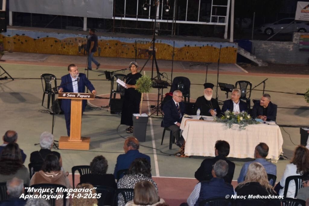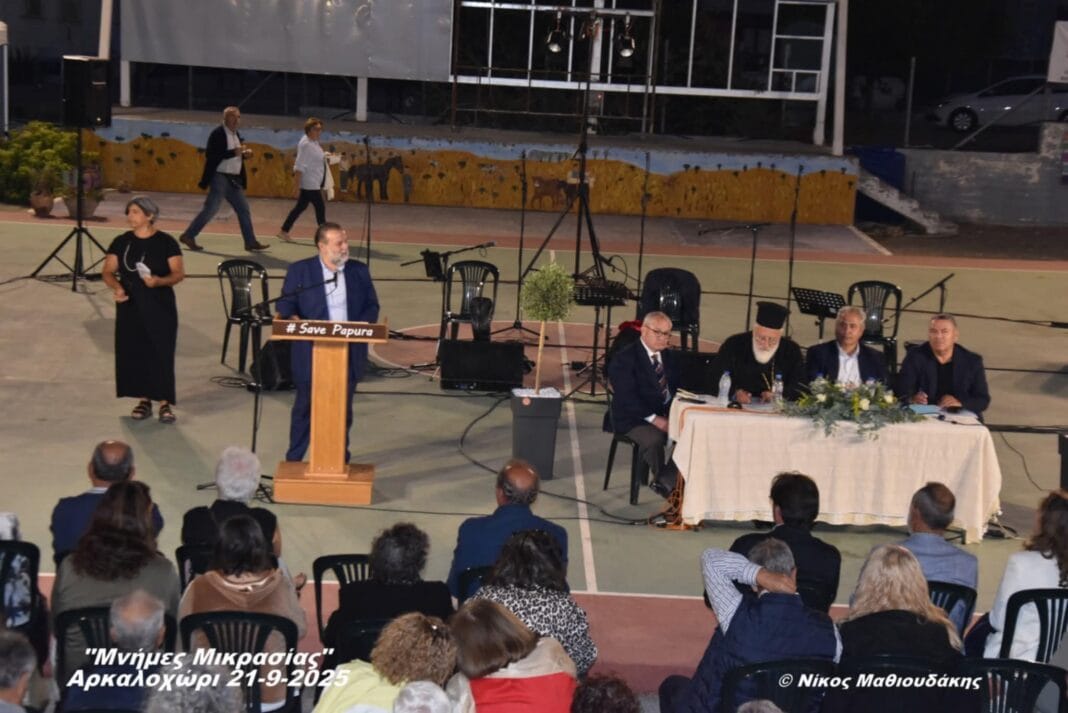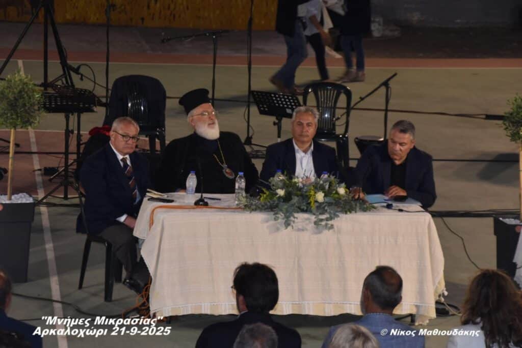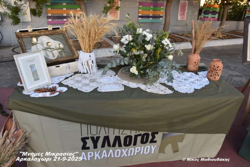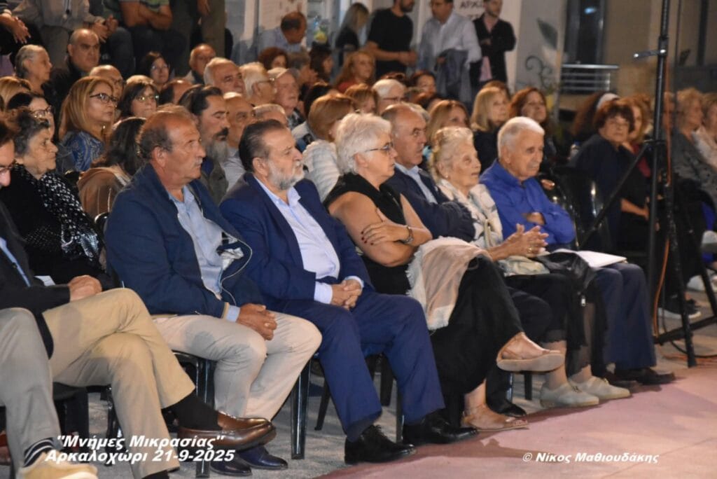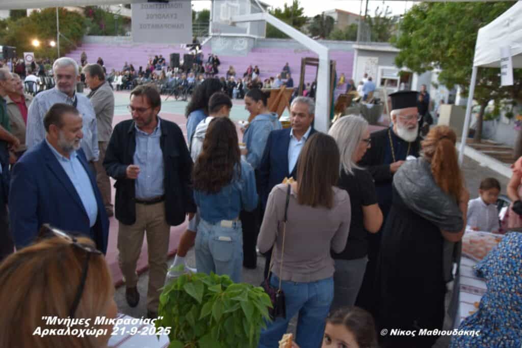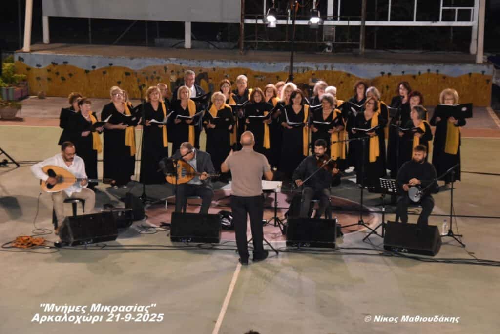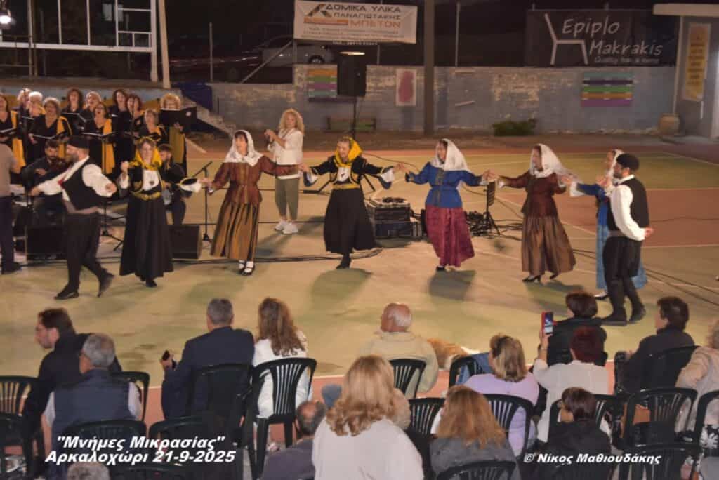 Παρουσία πλήθους κόσμου και μέσα σε κλίμα συγκίνησης, πραγματοποιήθηκε την Κυριακή 21 Σεπτεμβρίου 2025, στο Ανοιχτό Γήπεδο Μπάσκετ Αρκαλοχωρίου, η εκδήλωση «Μνήμες Μικρασίας». Η βραδιά ήταν αφιερωμένη στις αλησμόνητες πατρίδες και τον πλούσιο πολιτισμό του Μικρασιατικού Ελληνισμού, μέσα από ομιλίες, μουσική, χορό και γεύσεις της Μικράς Ασίας.