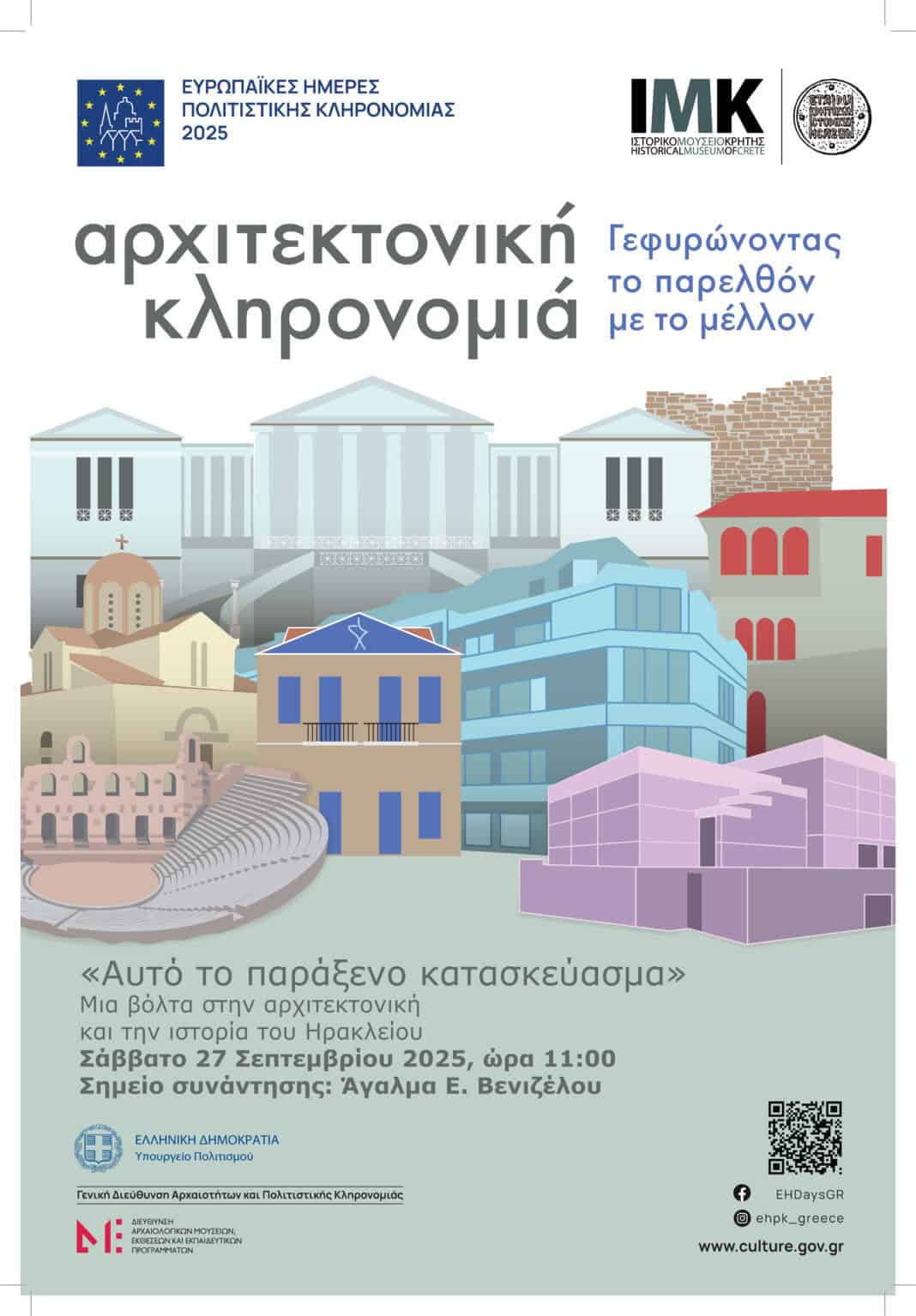 Ο φετινός εορτασμός των Ευρωπαϊκών Ημερών Πολιτιστικής Κληρονομιάς έχει τον γενικό τίτλο Αρχιτεκτονική Κληρονομιά – Γεφυρώνοντας το παρελθόν με το μέλλον. Το Ιστορικό Μουσείο Κρήτης συμμετέχει στον εορτασμό με έναν εκπαιδευτικό περίπατο στα κτίρια και την ιστορία του Ηρακλείου.