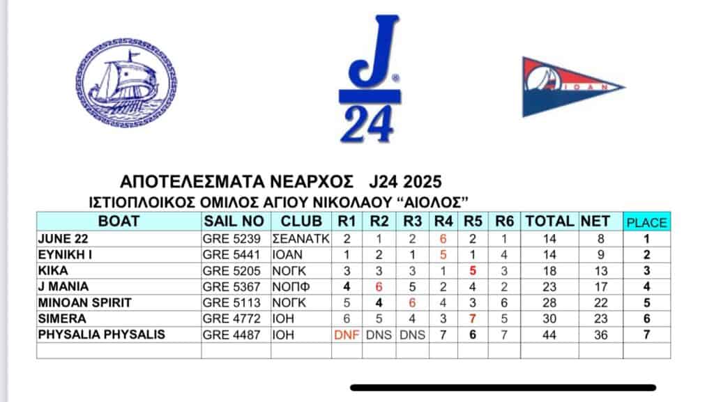 Το χάλκινο μετάλλιο κατέκτησαν οι αθλητές του Ναυταθλητικού Ομίλου Γαζίου Κρήτης (ΝΟΓΚ) στον Πανελλήνιο Διασυλλογικό Αγώνα Σκαφών Κλάσης J24, που διοργάνωσε ο Ιστιοπλοϊκός Όμιλος Αγίου Νικολάου «Αίολος» το περασμένο σαββατοκύριακο (20-21 Σεπτεμβρίου 2025), υπό την αιγίδα της Ελληνικής Ιστιοπλοϊκής Ομοσπονδίας.