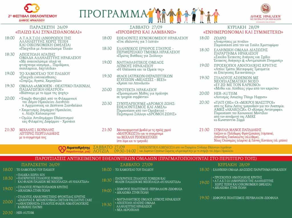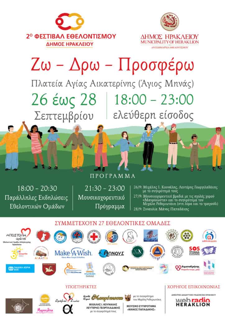 Με τη συμμετοχή 27 εθελοντικών ομάδων και με πλούσιο πρόγραμμα έρχεται το 2ο Φεστιβάλ Εθελοντισμού του Δήμου Ηρακλείου από την Αντιδημαρχία Εθελοντισμού από τις 26 έως τις 28 Σεπτεμβρίου στην Πλατεία Αγίας Αικατερίνης στην καρδιά της πόλης.