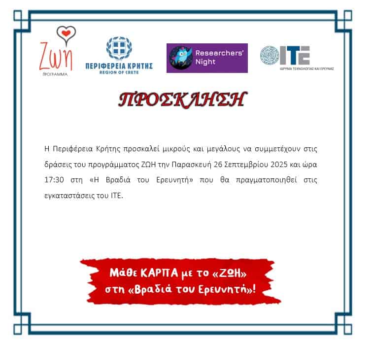 Το Πρόγραμμα «ΖΩΗ» έχει ως βασικό στόχο την ενίσχυση της παιδείας πρόληψης και της άμεσης ανταπόκρισης των πολιτών σε επείγοντα περιστατικά. Στο πλαίσιο αυτό, κατά τη διάρκεια της επιστημονικής δράσης «Βραδιά του Ερευνητή», που θα πραγματοποιηθεί την Παρασκευή 26 Σεπτεμβρίου 2025 στις εγκαταστάσεις του Ιδρύματος Τεχνολογίας και Έρευνας (ΙΤΕ).