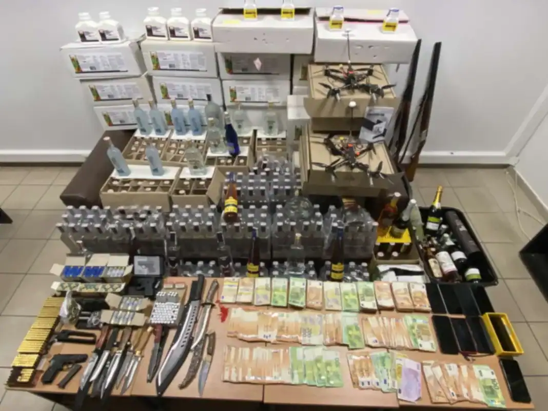 Συνολικά από τις έρευνες που διενεργήθηκαν σε τρία λεωφορεία, δέκα αυτοκίνητα, οκτώ σπίτια, δύο ταξιδιωτικά γραφεία και σε χώρο στάθμευσης λεωφορείων, βρέθηκαν και κατασχέθηκαν, μεταξύ άλλων: 529 φιάλες αλκοολούχων ποτών, 165 λίτρα και 7 κιλά πλαστών φυτοπροστατευτικών προϊόντων, 30 πακέτα τσιγάρα, χρηματικά ποσά συνολικού ύψους 212.000 ευρώ (και επιπλέον 1.100 δολαρίων ΗΠΑ και 20.000 γριβνών Ουκρανίας), δύο κυνηγετικά όπλα και τρία πιστόλια κρότου με 253 φυσίγγια και 177 αβολίδωτα φυσίγγια, πιστόλι τύπου στυλό, εννέα μαχαίρια, τέσσερα drones, τρία λεωφορεία και δύο αυτοκίνητα, 77 πυροτεχνήματα, ηλεκτρονικές συσκευές (κινητά τηλέφωνα, φορητοί υπολογιστές, ψηφιακά μέσα αποθήκευσης), όπως επίσης πλήθος χειρόγραφων σημειώσεων.