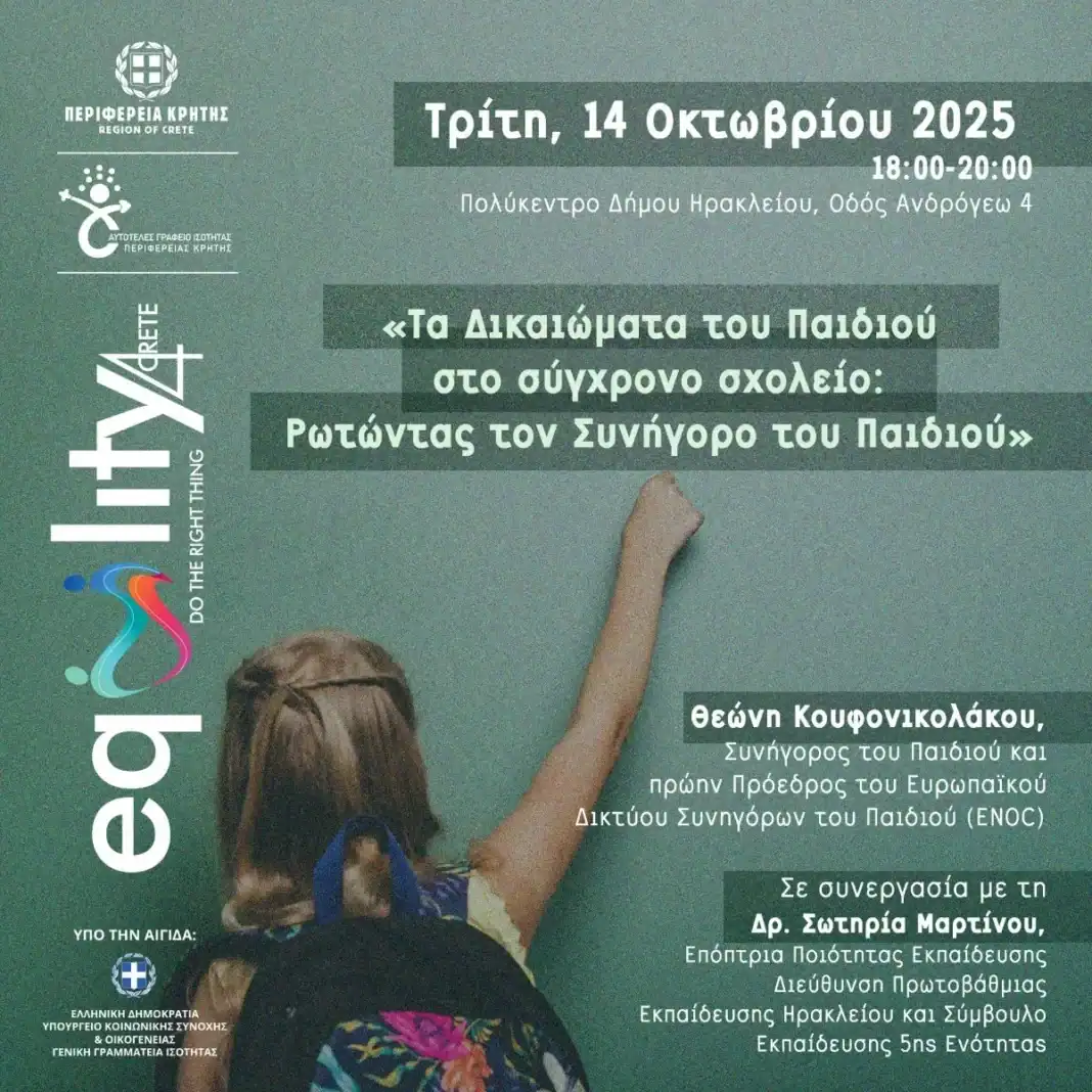 Στο πλαίσιο της Εκστρατείας της Περιφέρειας Κρήτης, Αυτοτελούς Γραφείου Ισότητας, «Equality4Crete – Do the Right Thing», διοργανώνεται ενημερωτική εκδήλωση με στόχο την ανάδειξη των δικαιωμάτων του παιδιού στη σύγχρονη εκπαιδευτική πραγματικότητα, την Τρίτη, 14 Οκτωβρίου 2025, 6:00-8:00μ.μ., στο Πολύκεντρο του Δήμου Ηρακλείου (Οδός Ανδρόγεω 4).