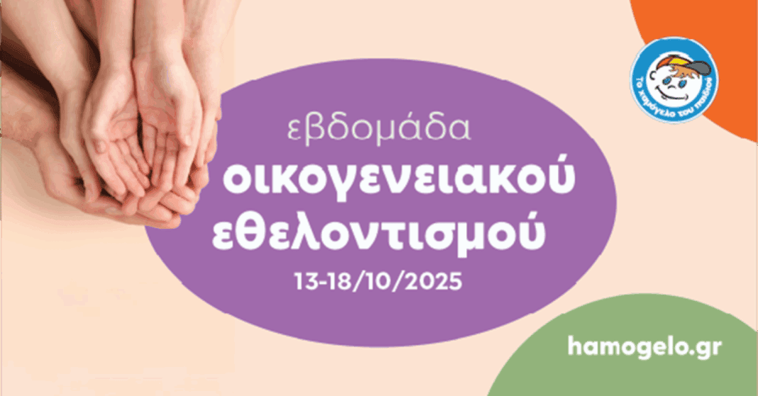 Με μεγάλη χαρά «To Χαμόγελο του Παιδιού», προσκαλεί μικρούς και μεγάλους στην Εβδομάδα Οικογενειακού Εθελοντισμού που θα πραγματοποιηθεί από τη Δευτέρα 13 Οκτωβρίου 2025 έως και το Σάββατο 18 Οκτωβρίου 2025 στα «Κέντρα Υποστήριξης παιδιών, νέων & ευάλωτων οικογενειών», πανελλαδικά (Αττική, Θεσσαλονίκη, Κόρινθος, Κρήτη – Ηράκλειο, Κρήτη – Ρέθυμνο, Κρήτη-Χανιά, Λάρισα, Πάτρα, Πύργος).