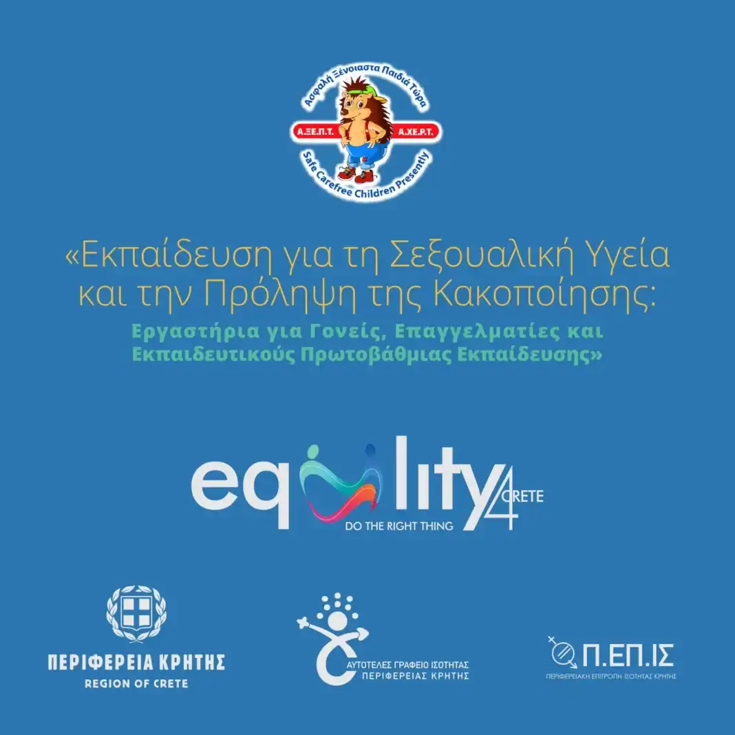 Η Περιφέρεια Κρήτης, μέσω του Αυτοτελούς Γραφείου Ισότητας και η Α.ΞΕ.Π.Τ. (Ασφαλή Ξένοιαστα Παιδιά Τώρα) υλοποιούν σε όλη την Κρήτη το Εκπαιδευτικό Πρόγραμμα «Σεξουαλική Υγεία και Πρόληψη της Κακοποίησης: Eργαστήρια για Γονείς, Επαγγελματίες και Εκπαιδευτικούς Α/θμιας Εκπ/σης».