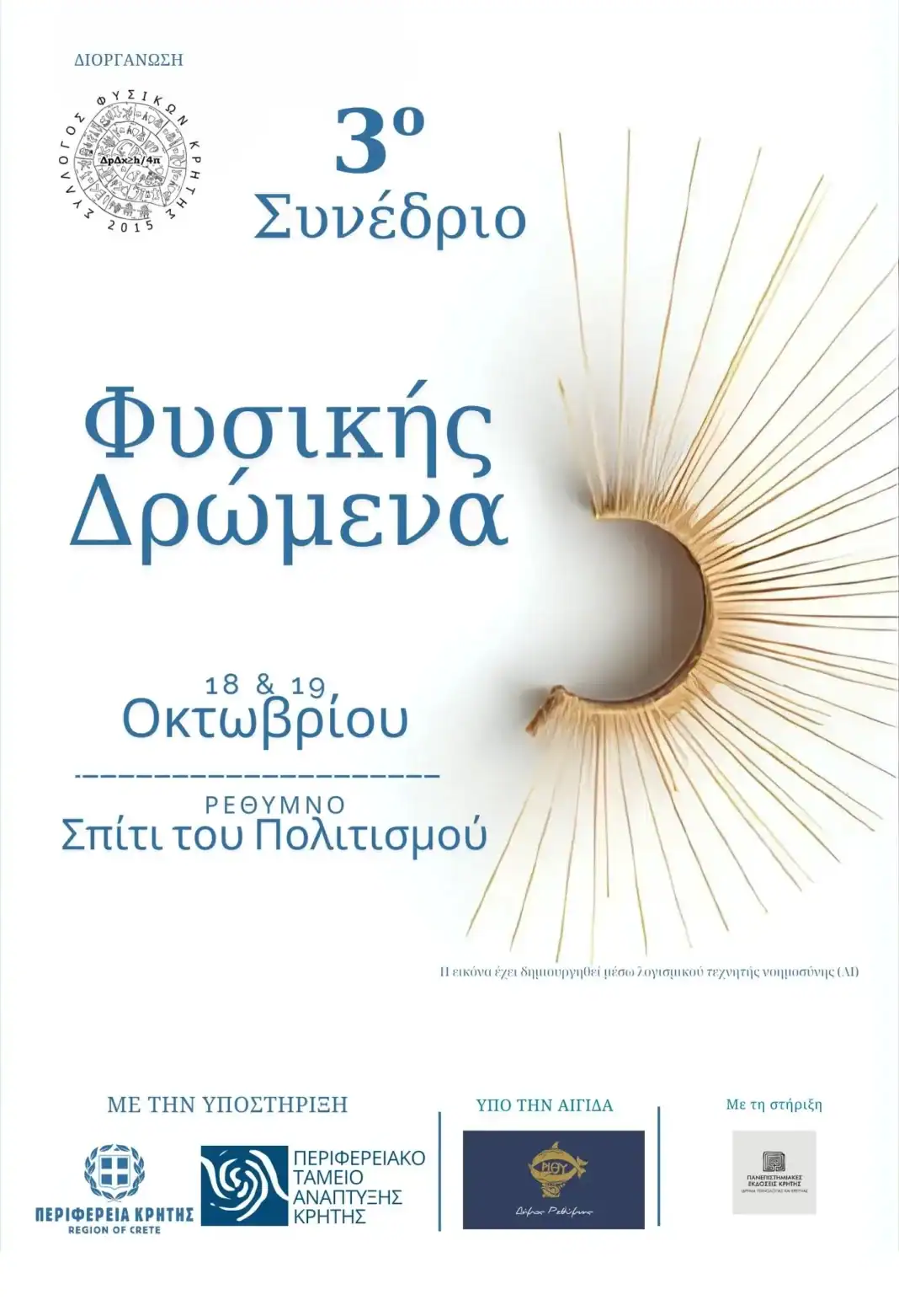 Η Περιφέρεια Κρήτης στηρίζει ενεργά το 3ο Συνέδριο «Φυσικής Δρώμενα», που θα πραγματοποιηθεί στις 18 και 19 Οκτωβρίου στο «Σπίτι του Πολιτισμού» στο Ρέθυμνο, με διοργανωτή τον Σύλλογο Φυσικών Κρήτης.