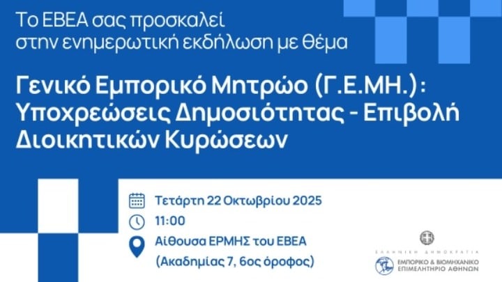 Ενημερωτική Εκδήλωση διοργανώνει το Εμπορικό και Βιομηχανικό Επιμελητήριο Αθηνών με θέμα: «Γενικό Εμπορικό Μητρώο (Γ.Ε.ΜΗ.): Υποχρεώσεις Δημοσιότητας – Επιβολή Διοικητικών Κυρώσεων», την Τετάρτη 22 Οκτωβρίου 2025 και ώρα 11:00, στην αίθουσα ΕΡΜΗΣ του επιμελητηρίου (Ακαδημίας 7, 6ος όροφος).
