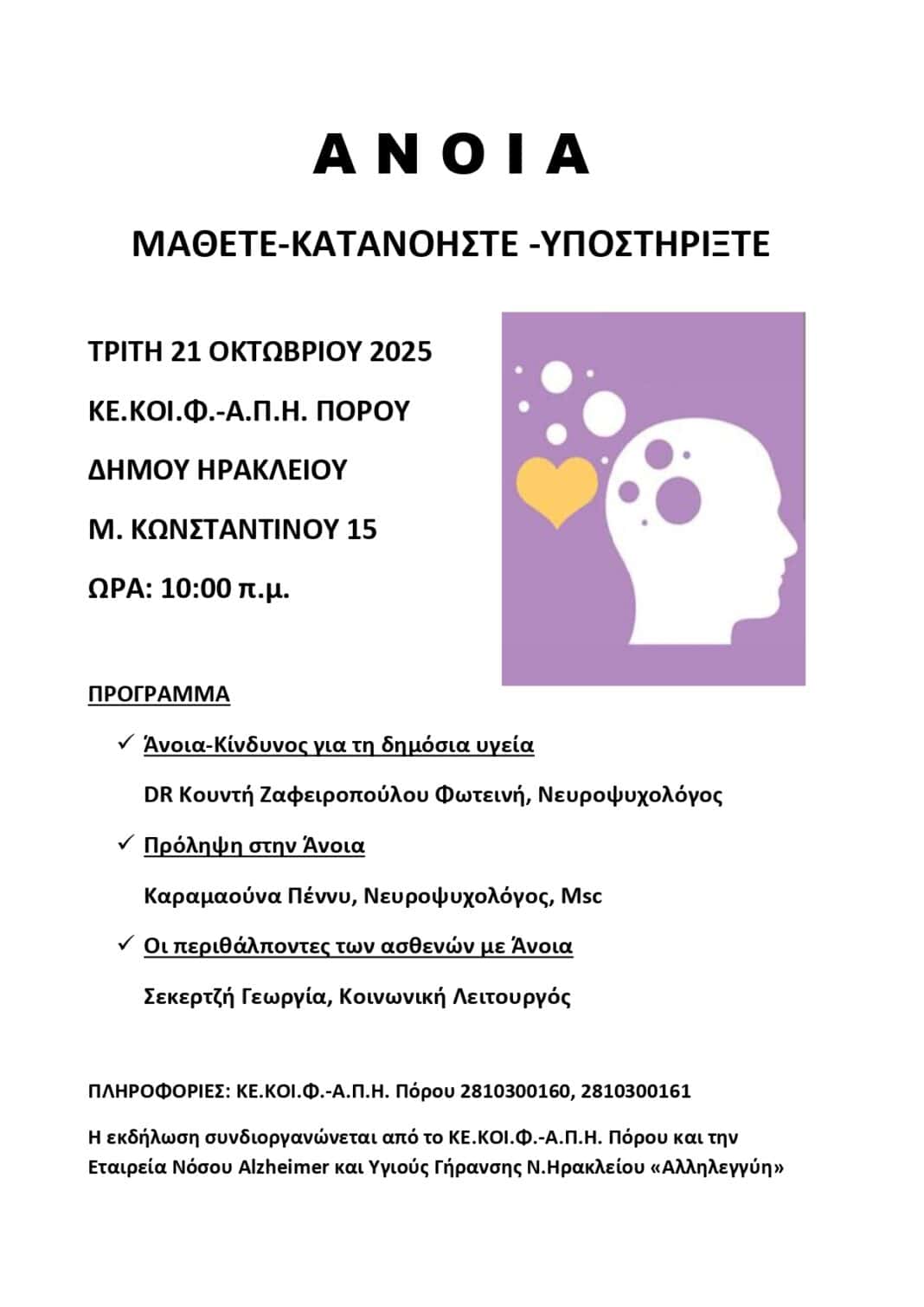 Eνημερωτική εκδήλωση με θέμα την ενημέρωση για την Άνοια,  διοργανώνει Το Κέντρο Κοινοτικής Φροντίδας – Ανοιχτής Προστασίας Ηλικιωμένων (ΚΕ.ΚΟΙ.Φ.-Α.Π.Η.) Πόρου του Δήμου Ηρακλείου, σε συνεργασία με την Εταιρεία Νόσου Alzheimer και Υγιούς Γήρανσης «ΑΛΛΗΛΕΓΓΥΗ», την Τρίτη 21 Οκτωβρίου 2025 στις 10:00 το πρωί, στο χώρο του Κέντρου (Μ. Κωνσταντίνου 15, Πόρος).