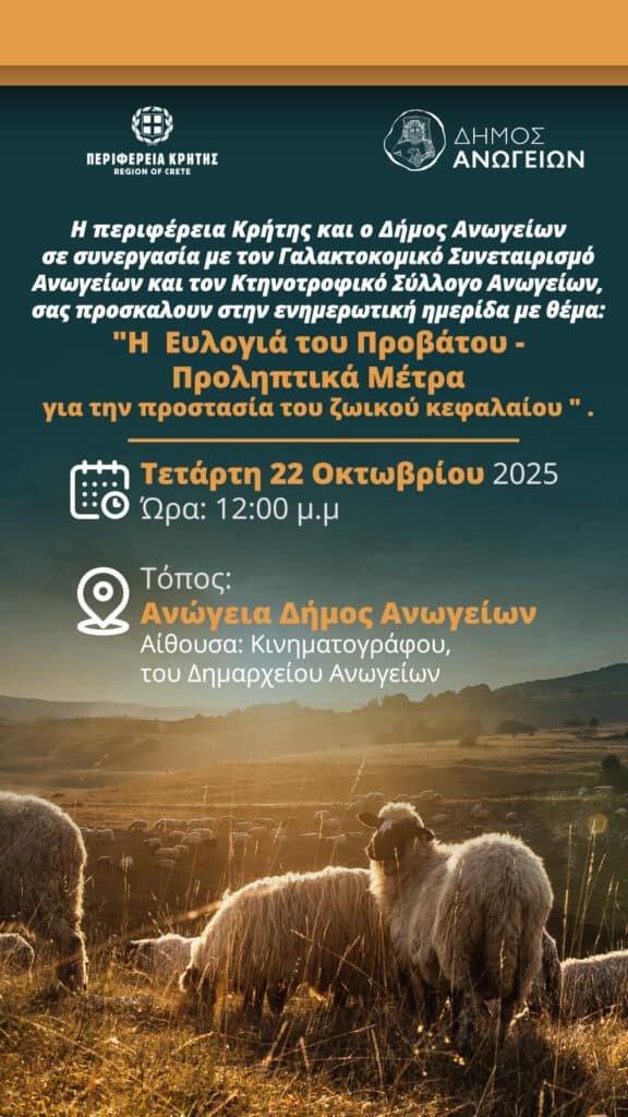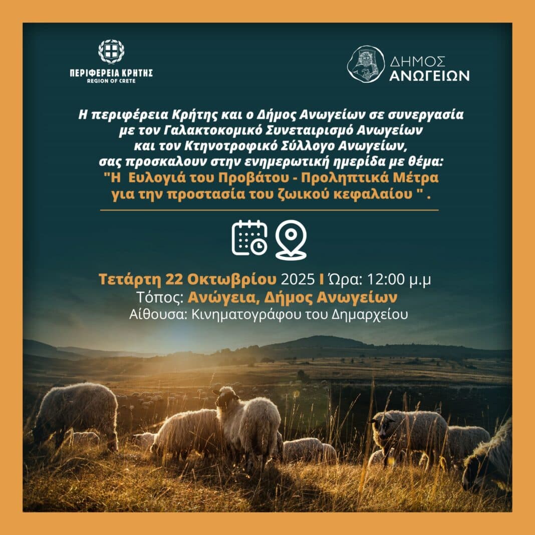 Η Περιφέρεια Κρήτης, με αίσθημα ευθύνης για την προστασία του ζωικού κεφαλαίου του νησιού, διοργανώνει ενημερωτική ημερίδα με θέμα: «Η Ευλογιά του Προβάτου – Προληπτικά Μέτρα για την Προστασία του Ζωικού Κεφαλαίου».