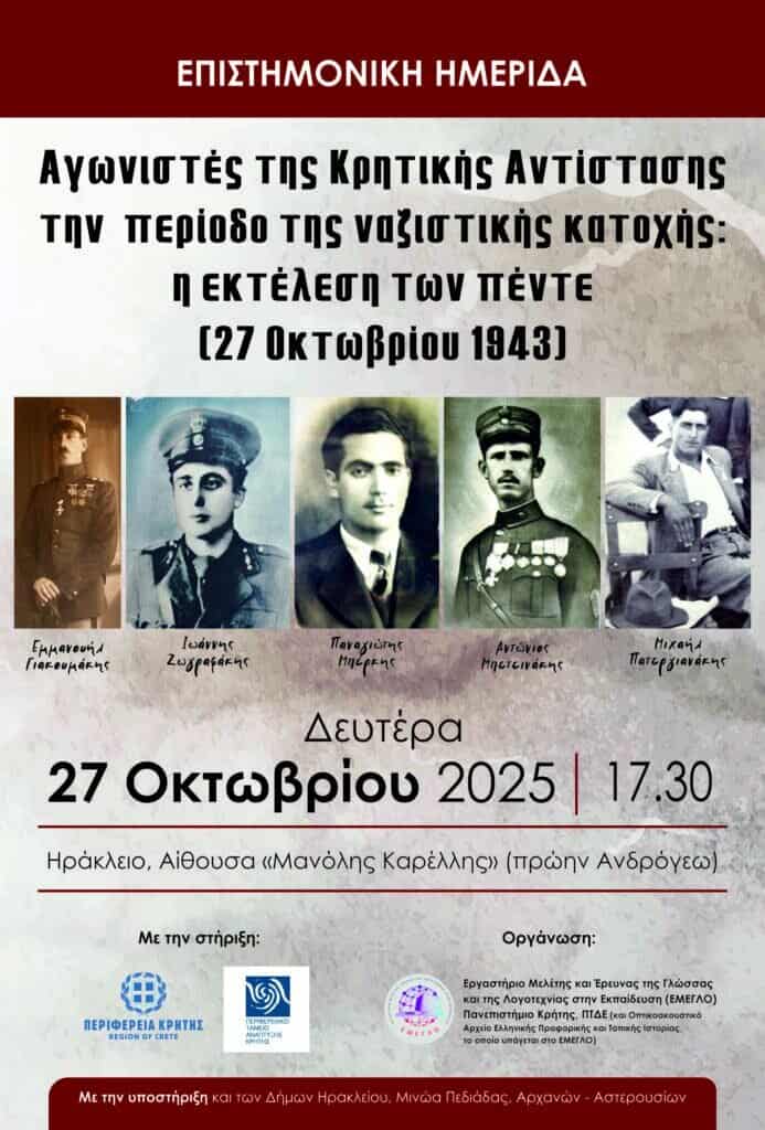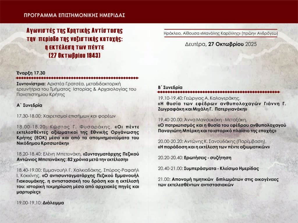 Τέλος, τη Δευτέρα 27 Οκτωβρίου, στις 5:30 μ.μ., θα πραγματοποιηθεί στο Ηράκλειο, στην Αίθουσα «Μανόλη Καρέλλη» (πρώην Ανδρόγεω), επιστημονική ημερίδα με θέμα: «Αγωνιστές της Κρητικής Αντίστασης την περίοδο της ναζιστικής κατοχής: Η εκτέλεση των πέντε (27 Οκτωβρίου 1943)». Η εκδήλωση διοργανώνεται από το Εργαστήριο Μελέτης και Έρευνας της Γλώσσας και της Λογοτεχνίας στην Εκπαίδευση (ΕΜΕΓΛΟ) και το Οπτικοακουστικό Αρχείο Ελληνικής Προφορικής και Τοπικής Ιστορίας του ΠΤΔΕ του Πανεπιστημίου Κρήτης, με τη στήριξη της Περιφέρειας Κρήτης, του Περιφερειακού Ταμείου Ανάπτυξης Κρήτης και των Δήμων Ηρακλείου, Μινώα Πεδιάδας και Αρχανών – Αστερουσίων.
