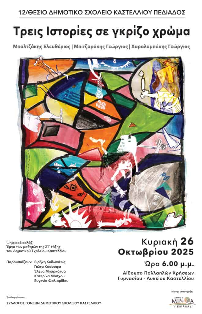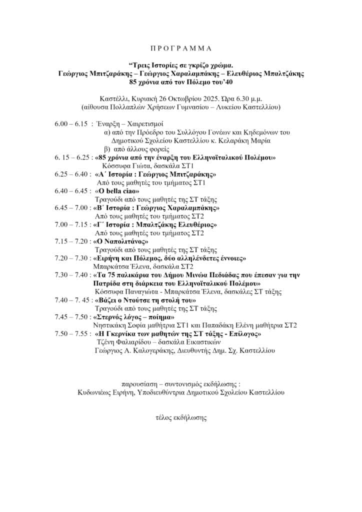 Η δεύτερη εκδήλωση θα πραγματοποιηθεί στο Καστέλλι, επίσης την Κυριακή 26 Οκτωβρίου, στις 6:00 μ.μ., στην Αίθουσα Πολλαπλών Χρήσεων του Γυμνασίου – Λυκείου Καστελλίου. Διοργανώνεται από το Δημοτικό Σχολείο Καστελλίου και τον Σύλλογο Γονέων, με θέμα: «Τρεις Ιστορίες σε γκρίζο χρώμα. Μπαλτζάκης Ελευθέριος, Μπιτζαράκης Γεώργιος, Χαραλαμπάκης Γεώργιος». Πρόκειται για μια συγκινητική παρουσίαση αφιερωμένη στη μνήμη τριών τοπικών αγωνιστών, μέσα από ιστορίες που αναδεικνύουν το ανθρώπινο πρόσωπο της Ιστορίας και τιμούν τη θυσία τους.