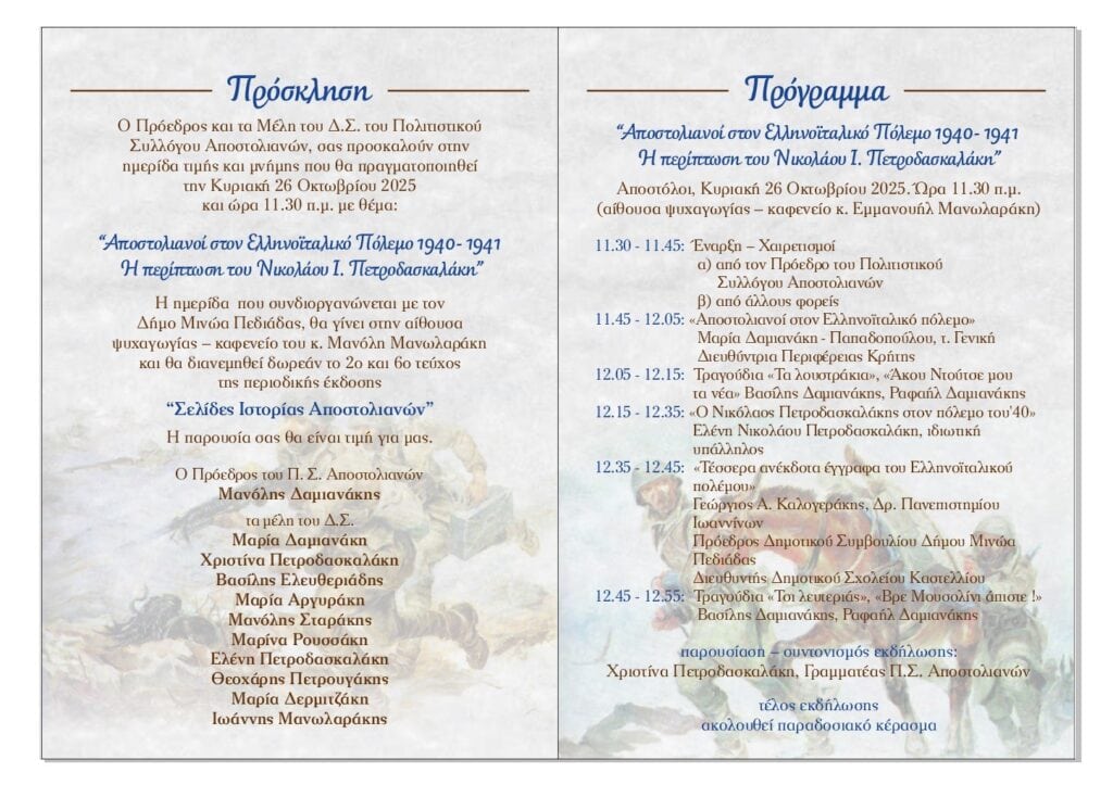 Η πρώτη εκδήλωση θα πραγματοποιηθεί στους Αποστόλους Πεδιάδος, την Κυριακή 26 Οκτωβρίου, στις 11:30 π.μ., στην Αίθουσα ψυχαγωγίας – καφενείο Μανόλη Μανωλαράκη. Τη διοργάνωση έχει αναλάβει ο Πολιτιστικός Σύλλογος Αποστολιανών, με θέμα: «Αποστολιανοί στον Ελληνοϊταλικό Πόλεμο. Η περίπτωση του Νικολάου Ι. Πετροδασκαλάκη». Η εκδήλωση είναι αφιερωμένη στη συμμετοχή των Αποστολιανών στον Ελληνοϊταλικό Πόλεμο, ενώ θα γίνει ειδική αναφορά στη ζωή και τη δράση του Νικολάου Ι. Πετροδασκαλάκη, φωτίζοντας πτυχές της προσωπικότητάς του και της προσφοράς του στην πατρίδα.
