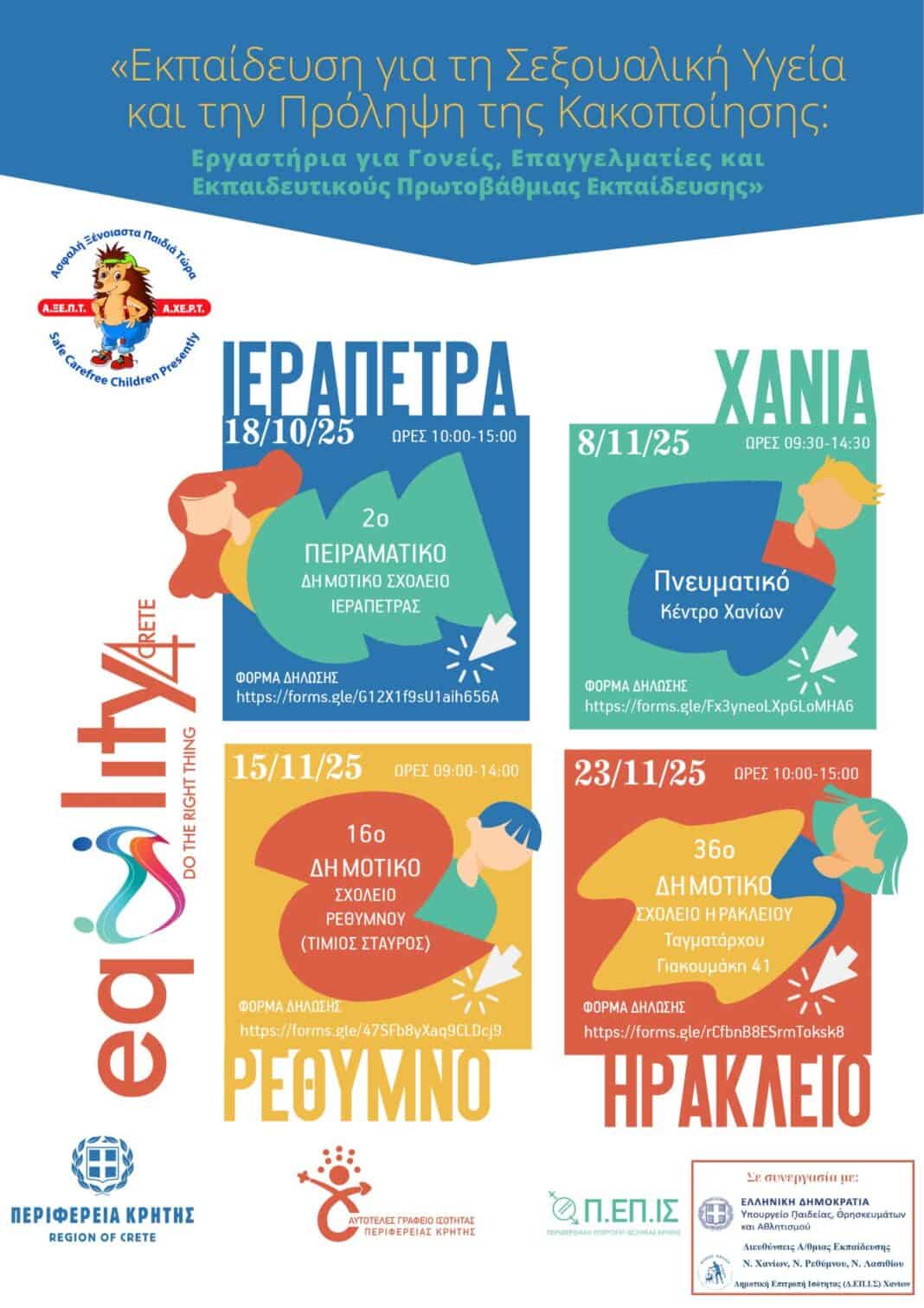 Η Περιφέρεια Κρήτης, μέσω του Αυτοτελούς Γραφείου Ισότητας και η Α.ΞΕ.Π.Τ. Ασφαλή Ξένοιαστα Παιδιά Τώρα σε συνεργασία με τη Διεύθυνση Π.Ε. Ν. Χανίων, των Συμβούλων Εκπ/σης ΠΕ60, Πε70 και τον Δήμο Χανίων – Δημοτική Επιτροπή Ισότητας των Φύλων (Δ.ΕΠ.ΙΣ.) Χανίων, σας προσκαλούν να συμμετάσχετε στο επιμορφωτικό πρόγραμμα που θα υλοποιηθεί στα Χανιά, το Σάββατο 8 Νοεμβρίου 2025 τις ώρες 9.30 – 14.30 στο Πνευματικό Κέντρο Χανίων, με τίτλο: