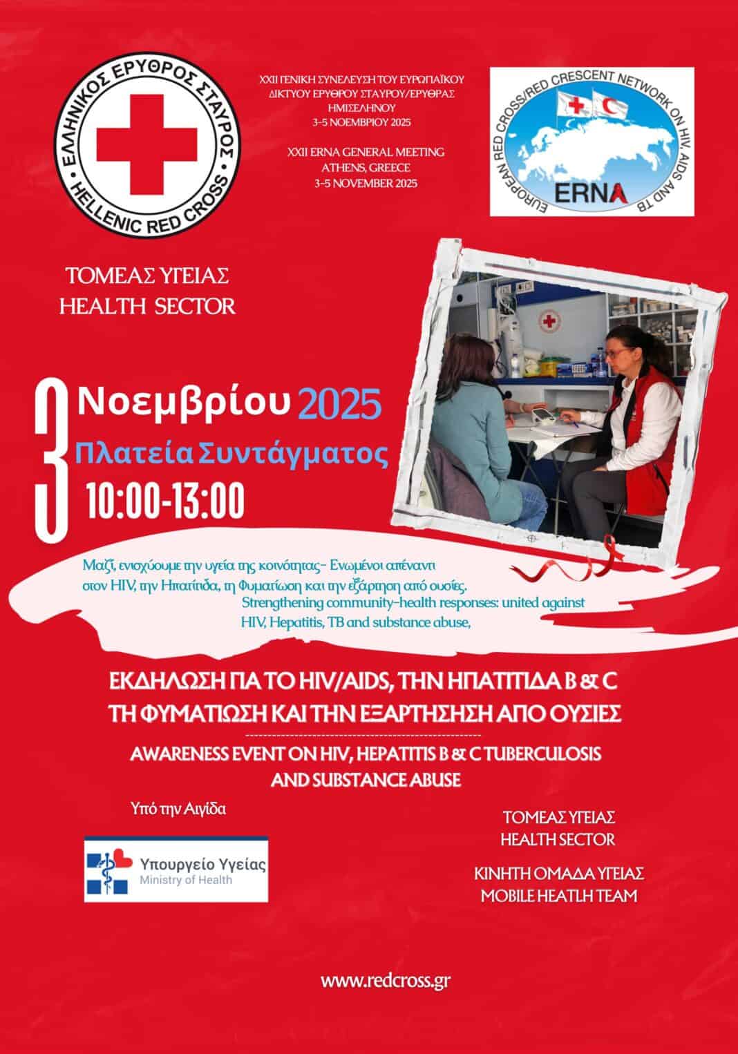 Ο Ελληνικός Ερυθρός Σταυρός (E.E.Σ.) ανακοινώνει με ιδιαίτερη χαρά τη διοργάνωση μεγάλης εκδήλωσης στην Πλατεία Συντάγματος, την Δευτέρα 3 Νοεμβρίου 2025, και ώρες 10:00 έως 13:00, στο πλαίσιο των παράλληλων εργασιών της 22ης ετήσιας συνάντησης του Ευρωπαϊκού Δικτύου Ερυθρού Σταυρού/Ερυθράς Ημισελήνου (ERNA) που θα φιλοξενηθεί από τον Ε.Ε.Σ. στην Αθήνα, το διάστημα 3-5 Νοεμβρίου 2025 και υλοποιείται υπό την Αιγίδα του Υπουργείου Υγείας.  Η εν λόγω εκδήλωση στην πλατεία Συντάγματος, εντάσσεται στις πρωτοβουλίες του Τομέα Υγείας του Ελληνικού Ερυθρού Σταυρού, στη διάρκεια της οποίας, η Κινητή Ομάδα Υγείας θα μεταφέρει το μήνυμα: «Μαζί, ενισχύουμε την υγεία της κοινότητας- Ενωμένοι απέναντι στον HIV, την Ηπατίτιδα, τη Φυματίωση και την εξάρτηση από ουσίες».