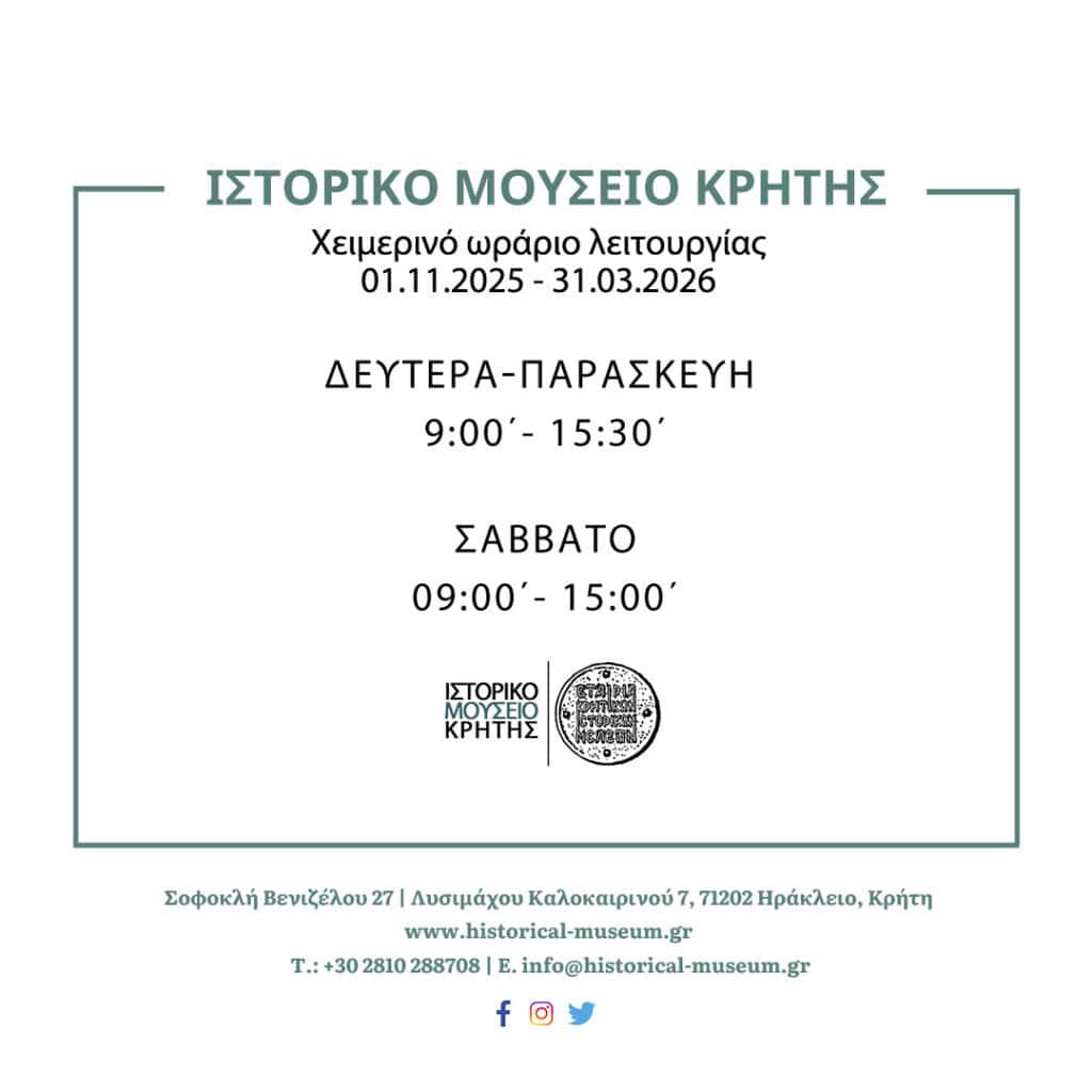 Από τη Σάββατο 1 Νοεμβρίου εφαρμόζεται το χειμερινό ωράριο λειτουργίας του Ιστορικού Μουσείου Κρήτης, το οποίο διαμορφώνεται ως εξής: