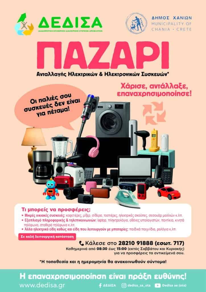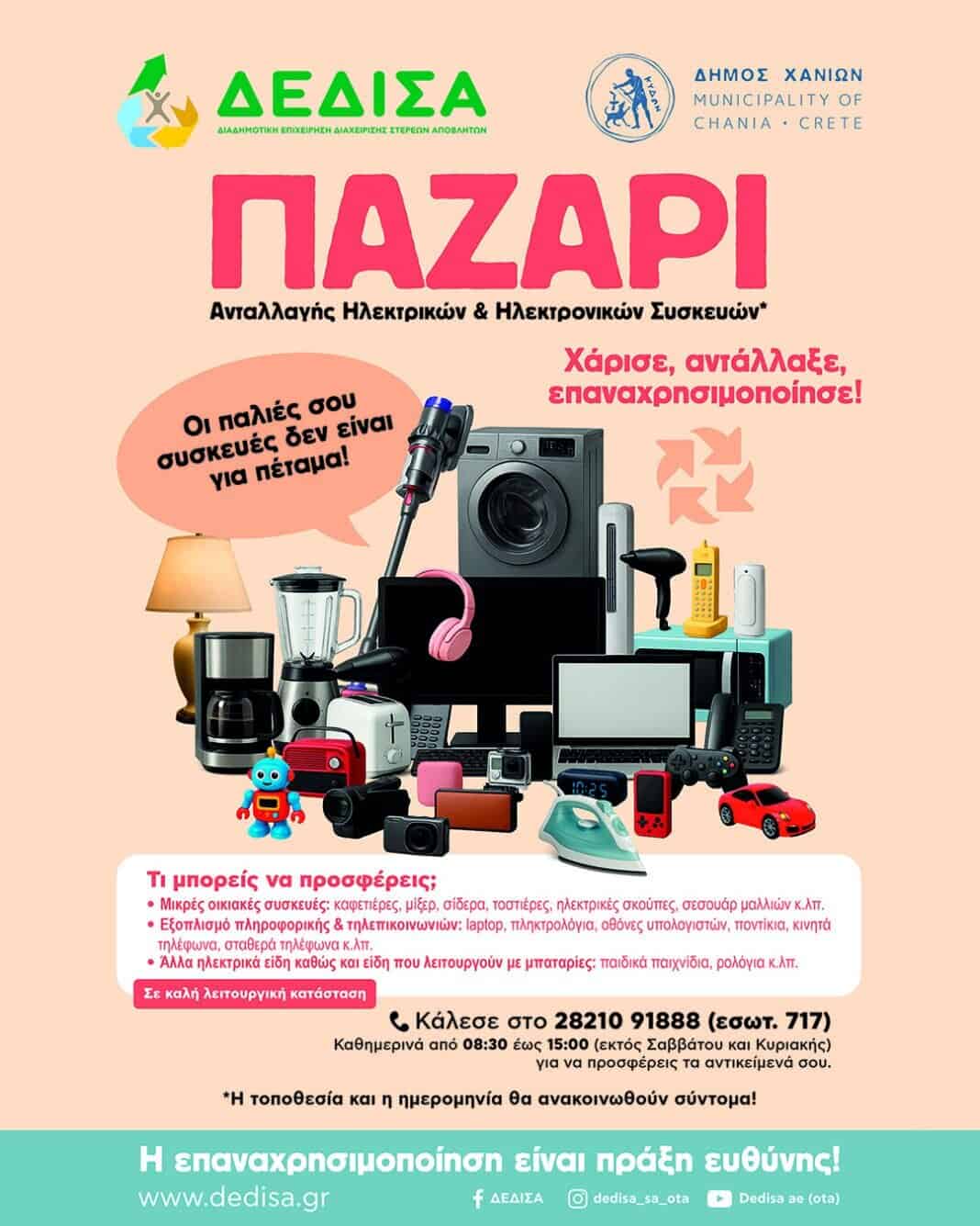 Η Διαδημοτική Επιχείρηση Διαχείρισης Στερεών Αποβλήτων [ΔΕΔΙΣΑ Α.Ε. (ΟΤΑ)] και ο Δήμος Χανίων, στο πλαίσιο της Ευρωπαϊκής Εβδομάδας Μείωσης Αποβλήτων (EWWR), διοργανώνουν Παζάρι «Ανταλλαγής» Ηλεκτρικών και Ηλεκτρονικών Συσκευών, με στόχο την προώθηση της επαναχρησιμοποίησης, τη μείωση των αποβλήτων και την ευαισθητοποίηση της κοινωνίας γύρω από την κυκλική οικονομία.