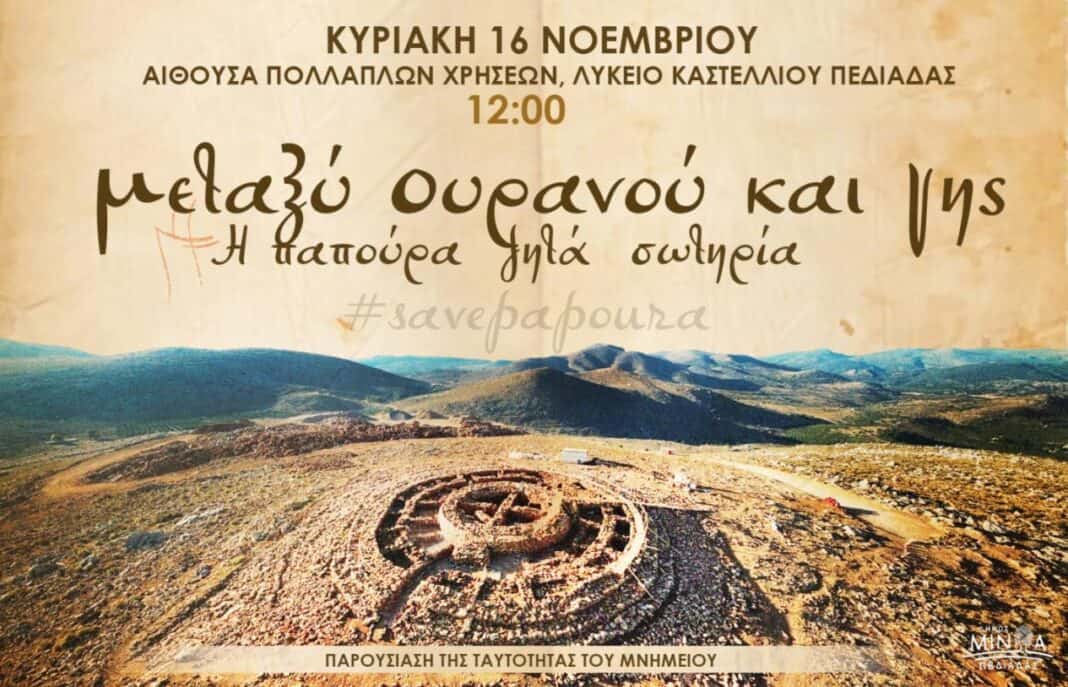 Με στόχο την περαιτέρω ενημέρωση και ευαισθητοποίηση του κοινού για την ανάγκη προστασίας του Μνημείου στο λόφο της Παπούρας, ο Δήμος Μινώα Πεδιάδας διοργανώνει την Κυριακή 16 Νοεμβρίου 2025, στην Αίθουσα Πολλαπλών Χρήσεων του Λυκείου Καστελλίου, στις 12:00 το μεσημέρι, εκδήλωση αφιερωμένη στην παρουσίαση της ταυτότητας του μοναδικού Μνημείου στο λόφο της Παπούρας.