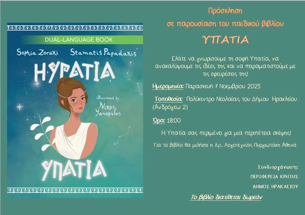 Ελάτε να γνωρίσουμε τη σοφή Υπατία. Να ανακαλύψουμε τις ιδέες της και να πειραματιστούμε με τις εφευρέσεις της! Για το βιβλίο θα μιλήσει η Δρ. Πυργιωτάκη