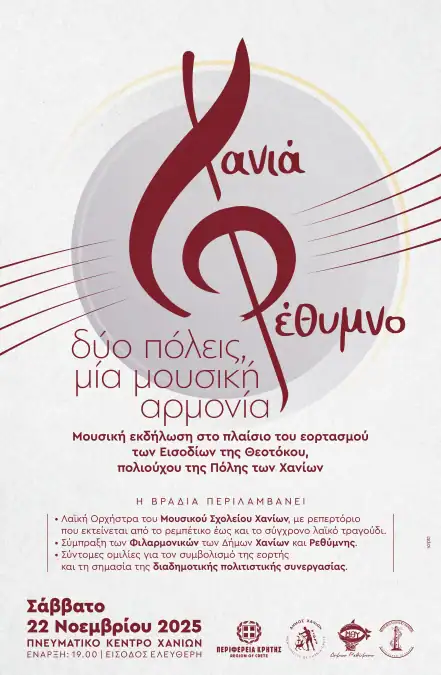 Η Περιφέρεια Κρήτης – Περιφερειακή Ενότητα Χανίων, σε συνδιοργάνωση με το Δήμο Χανίων, το Δήμο Ρεθύμνου και το Μουσικό Σχολείο Χανίων, στο πλαίσιο του εορτασμού των Εισοδίων της Θεοτόκου – πολιούχου των Χανίων, διοργανώνει μια ξεχωριστή μουσική και πολιτιστική εκδήλωση με τίτλο: