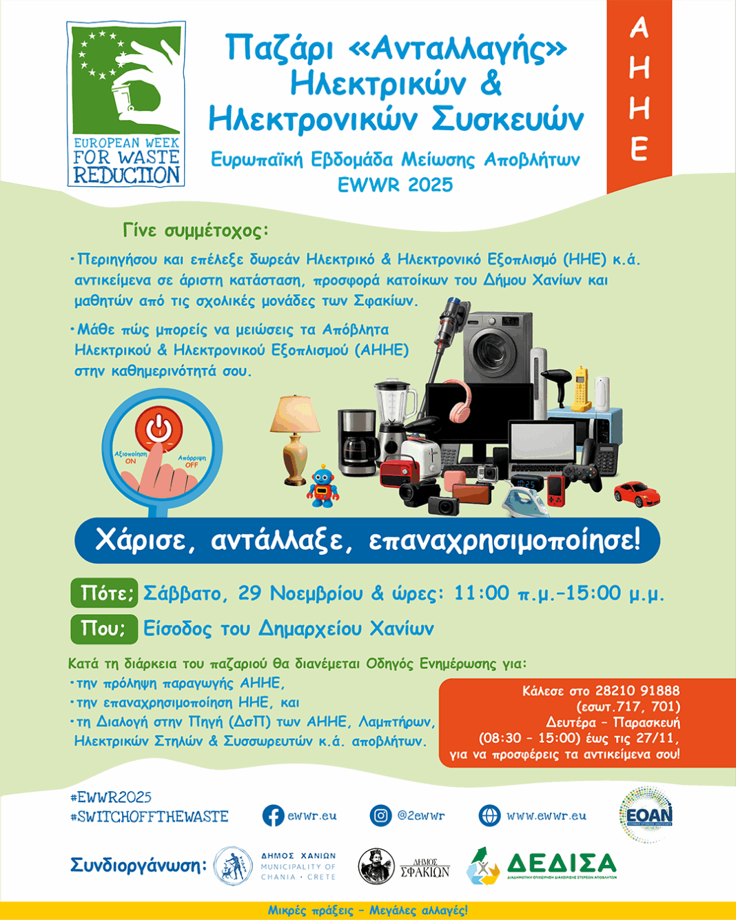 Η Διαδημοτική Επιχείρηση Διαχείρισης Στερεών Αποβλήτων [ΔΕΔΙΣΑ Α.Ε. (ΟΤΑ)], σε συνεργασία με τον Δήμο Χανίων, υπενθυμίζουν στους πολίτες ότι βρίσκεται σε εξέλιξη η συγκέντρωση Ηλεκτρικών και Ηλεκτρονικών Συσκευών για το Παζάρι «Ανταλλαγής», μια δράση που προωθεί τη μείωση των αποβλήτων μέσα από τη προσφορά και την επαναχρησιμοποίηση.