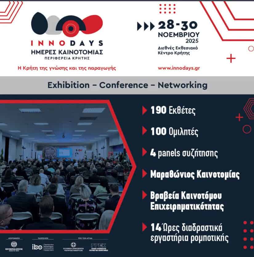 Το μεγαλύτερο γεγονός καινοτομίας και επιχειρηματικότητας του νησιού, τις Ημέρες Καινοτομίας Περιφέρειας Κρήτης «InnoDays 2025», διοργανώνει για μία ακόμη χρονιά η Περιφέρεια Κρήτης. Η διοργάνωση, που φέτος έχει τίτλο «Η Κρήτη της Γνώσης και της Παραγωγής», θα πραγματοποιηθεί από τις 28 έως τις 30 Νοεμβρίου 2025 στο Διεθνές Εκθεσιακό Κέντρο Κρήτης, στις Γούβες Ηρακλείου.