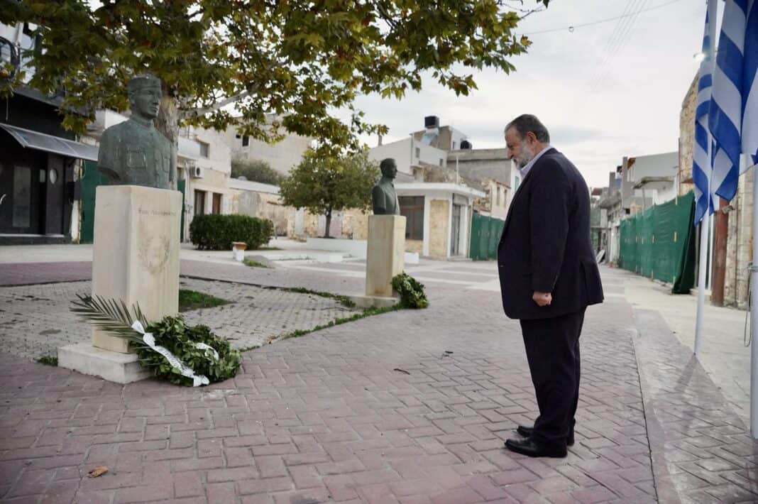 Πιο συγκεκριμένα ανέφερε: «Πολλοί συνδημότες μας αγωνίστηκαν και θυσιάστηκαν για την Ελευθερία, όπως ο Ναπολέων Σουκατζίδης, ο Μανώλης Λαμπράκης, ο Αντώνης Γιαμαλάκης, ο Μιχάλης Σταυρακάκης και τόσοι άλλοι, γνωστοί και άγνωστοι. Ο τόπος μας πλήρωσε βαρύ τίμημα. Είναι ενδεικτικό ότι το σύνολο των θυμάτων του Δήμου Μινώα Πεδιάδας της περίοδο του Β΄ Παγκοσμίου Πολέμου ανήλθαν σε 245  (75 στον Ελληνοϊταλικό Πόλεμο, 16 στη Μάχη της Κρήτης και 154 στην Κατοχή). Η ενότητα, η αξιοπρέπεια και η αυταπάρνηση τους, αποτελούν οδηγό και ευθύνη για όλους μας και χρέος μας είναι να μεταλαμπαδεύσουμε τα διδάγματά τους στις νεότερες γενιές».