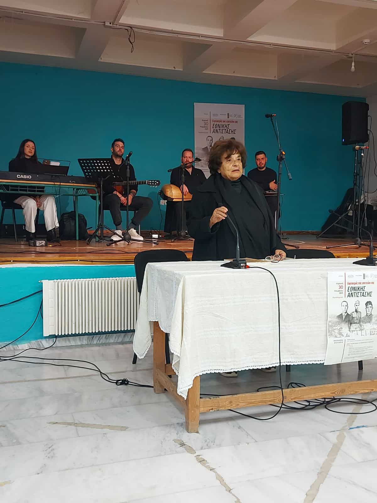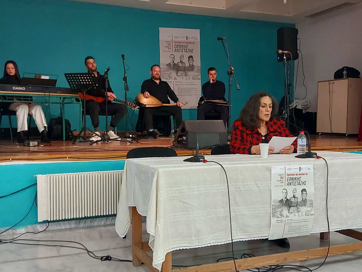 Η φιλόλογος, ιστορική ερευνήτρια και συγγραφέας Άννα Μανουκάκη – Μεταξάκη ανέπτυξε το θέμα: «Οι κάτοικοι του Αρκαλοχωρίου και της γύρω περιοχής στην Αντίσταση κατά του Άξονα στα χρόνια της Κατοχής», φωτίζοντας σημαντικά γεγονότα και άγνωστες πτυχές εκείνης της περιόδου. Επίσης, η εκπαιδευτικός Αργυρώ Λυραράκη προχώρησε σε ομιλία με θέμα: «Εθνική Αντίσταση… που επάνω της τσακίζεται των Γερμανών το διάβα…»,ενώ η Καθηγήτρια Αγγλικών Ιωάννα Ζορμπαδακη, αφηγήθηκε μαρτυρίες Αντιστασιακών.