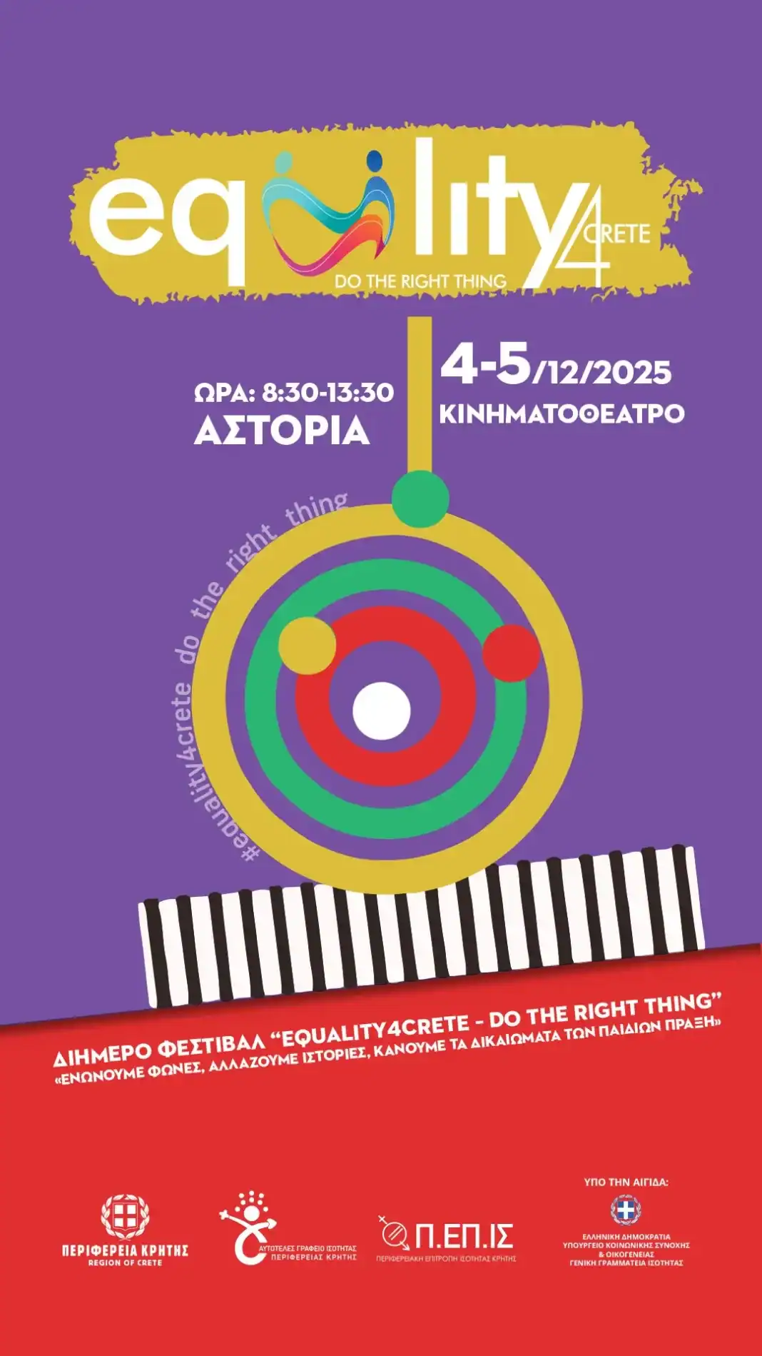 Για δεύτερη συνεχόμενη χρονιά, η Περιφέρεια Κρήτης και το Αυτοτελές Γραφείο Ισότητας διοργανώνουν το Διήμερο Φεστιβάλ Ανθρωπίνων Δικαιωμάτων «Equality4Crete – Do the Right Thing», στις 4 και 5 Δεκεμβρίου 2025, με αφορμή την Παγκόσμια Ημέρα Αναπηρίας (3 Δεκεμβρίου) και την Παγκόσμια Ημέρα Ανθρωπίνων Δικαιωμάτων (10 Δεκεμβρίου), 8:30-1:30μ.μ., στο κινηματοθέατρο Αστόρια, με ελεύθερη είσοδο.