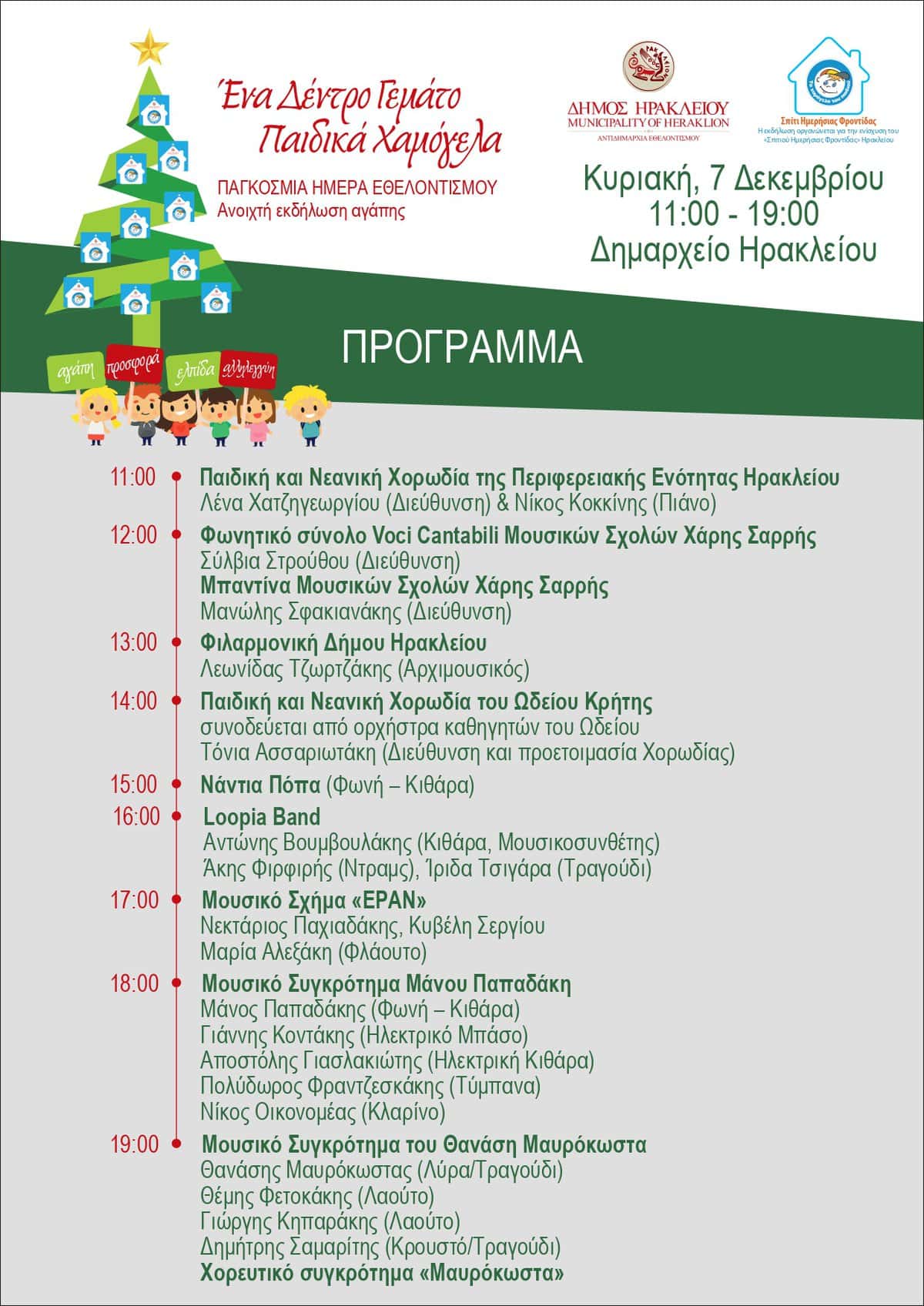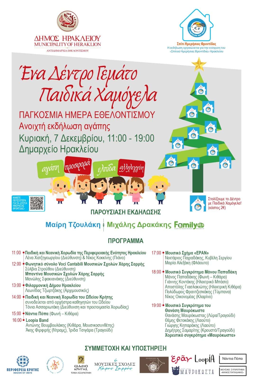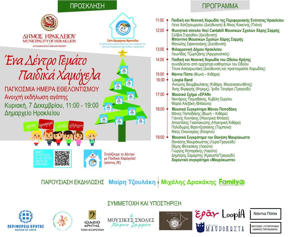 Ο Δήμος Ηρακλείου και η Αντιδημαρχία Εθελοντισμού με αφορμή την Παγκόσμια Ημέρα Εθελοντισμού, στις 5 Δεκεμβρίου, διοργανώνουν ανοικτή εκδήλωση αγάπης με τίτλο «Ένα Δέντρο Γεμάτο Παιδικά Χαμόγελα», την Κυριακή 7 Δεκεμβρίου, 11:00- 19:00 στη Λότζια.