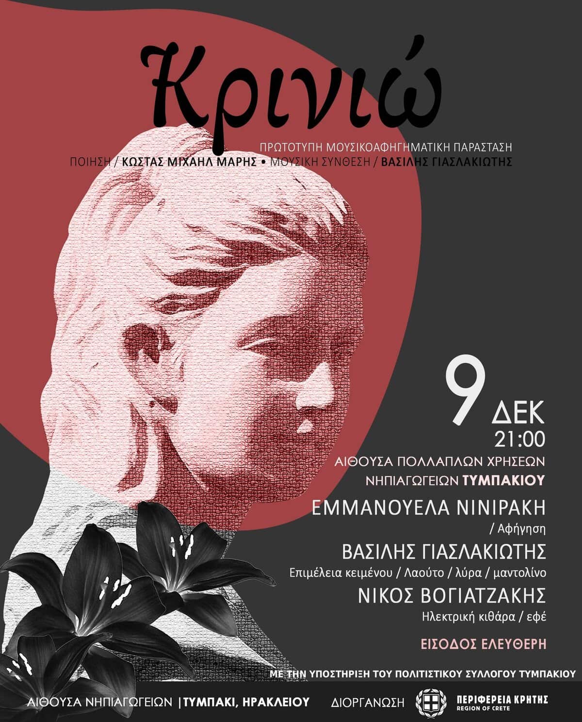Η μουσικοθεατρική παράσταση «Κρινιώ» παρουσιάζεται με την υποστήριξη της Περιφέρειας Κρήτης, στις 8 Δεκεμβρίου 2025, στις 9:00μ.μ., στο Μουσείο Μουσικών Οργάνων «Θύραθεν» και στις 9 Δεκεμβρίου 2025, στις 9:00μ.μ., στην Αίθουσα Πολλαπλών Χρήσεων Νηπιαγωγείου Τυμπακίου.