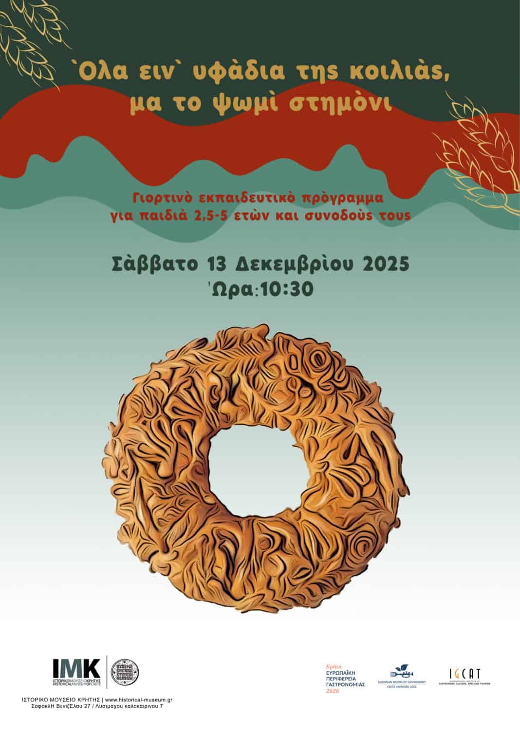 Το Σάββατο 13 Δεκεμβρίου, ώρα έναρξης 10.30, προετοιμαζόμαστε για τις γιορτινές μέρες με οδηγό μας τις ζύμες, τα τσουρέκια και άλλα γιορτινά αρτοσκευάσματα από την ιστορία του Ηρακλείου. Το τμήμα Εκπαιδευτικών Προγραμμάτων του Ιστορικού Μουσείου Κρήτης προσκαλεί τα παιδιά σε μια βόλτα εξερεύνησης μέσα στο Μουσείο, ακολουθώντας τη μυρωδιά του ψωμιού. Θα γνωρίσουμε τη διαδικασία παραγωγής και κατανάλωσης, τις παραδόσεις, τις δεισιδαιμονίες και τις τέχνες που συνδέονται με το σημαντικό αυτό υλικό της διατροφικής μας πυραμίδας. Θα πούμε το ψωμί ψωμάκι ή θα φάμε μαζί ψωμί κι αλάτι;