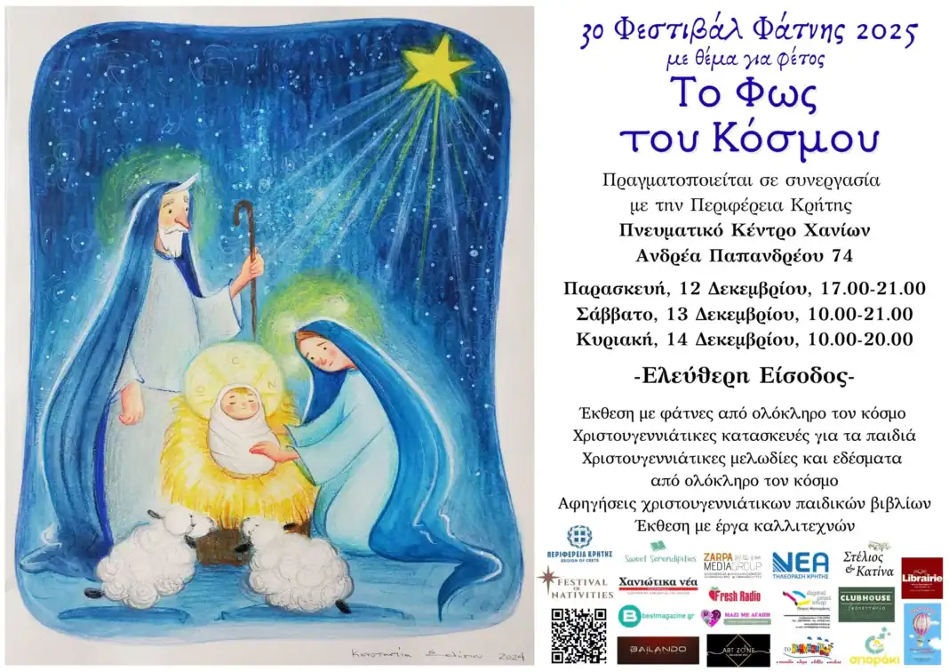 3ο Φεστιβάλ Φάτνης με θέμα «Το Φως του Κόσμου», την Παρασκευή 12 Δεκεμβρίου το απόγευμα, το Σάββατο 13 και Κυριακή 14 Δεκεμβρίου 2025, από το πρωί έως το βράδυ, στο Πνευματικό Κέντρο Χανίων. Ακολουθεί παρακάτω σύνδεσμος με το πρόγραμμα για κάθε ημέρα: