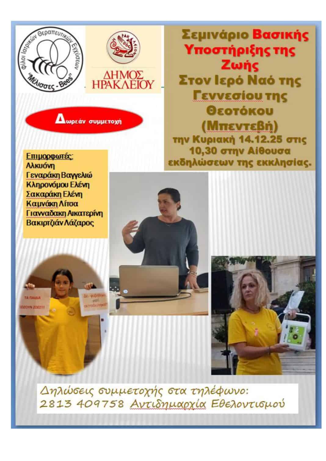Σεμινάριο Βασικής Υποστήριξης της Ζωής διοργανώνουν η Αντιδημαρχία Εθελοντισμού του Δήμου Ηρακλείου και οι «Φίλοι Ιατρικών Θεραπευτικών Εντόμων – Μέλισσες» την Κυριακή 14 Δεκεμβρίου 2025, στις 10:30 στην αίθουσα εκδηλώσεων του Ιερού Ναού Γενεσίου Θεοτόκου (Μπεντεβή).