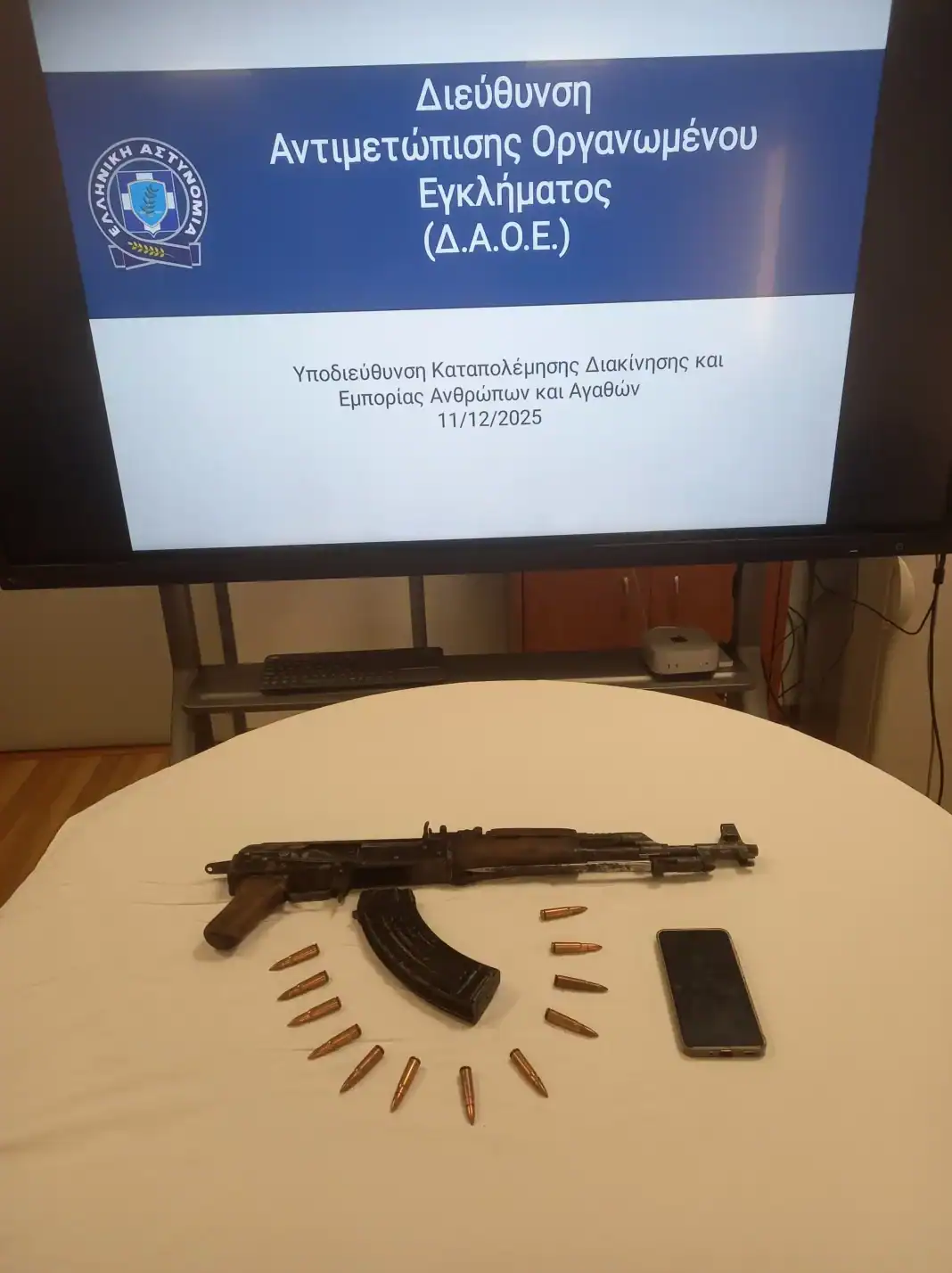 Από την Υποδιεύθυνση Καταπολέμησης Διακίνησης και Εμπορίας Ανθρώπων και Αγαθών της Διεύθυνσης Αντιμετώπισης Οργανωμένου Εγκλήματος συνελήφθη πρώτες πρωινές ώρες την Πέμπτη 11 Δεκεμβρίου 2025, σε περιοχή της Αθήνας, 20χρονος ημεδαπός, ο οποίος κατείχε και μετέφερε πολεμικό τυφέκιο «Kalashnikov».
