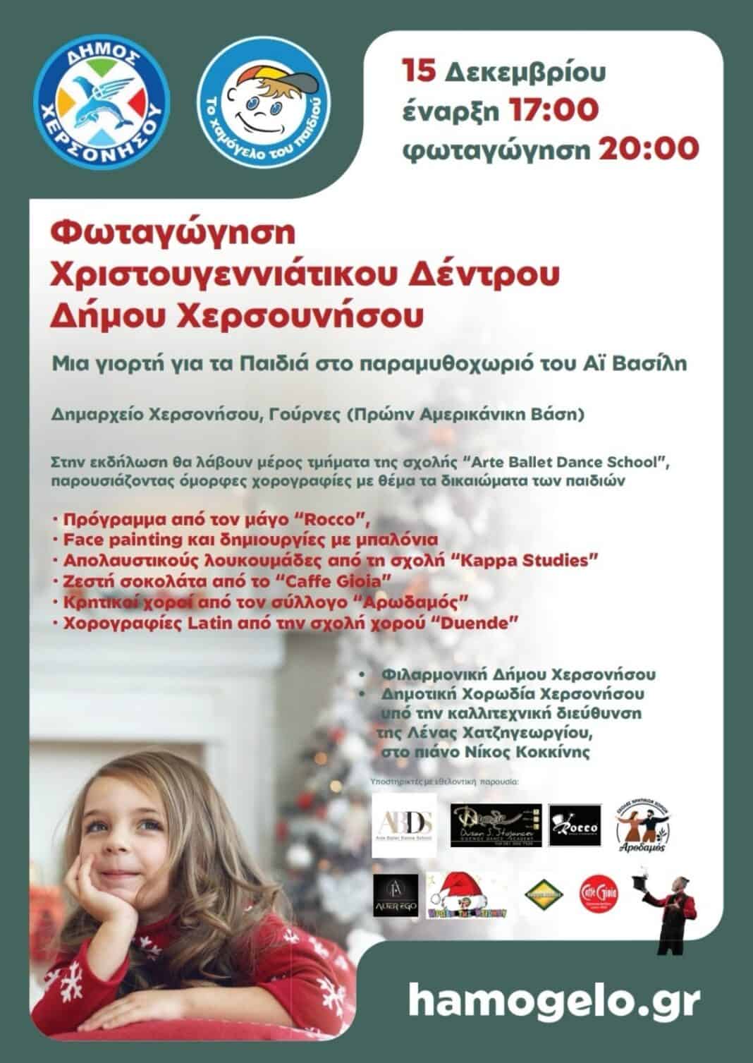 Ο Δήμος Χερσονήσου, σε συνεργασία με  «Το Χαμόγελο του Παιδιού», σας προσκαλεί να ζήσετε τη μαγεία των Χριστουγέννων στο Παραμυθοχωριό του Αϊ Βασίλη, σήμερα Δευτέρα 15 Δεκεμβρίου στο Δημαρχείο Χερσονήσου στις Γούρνες (Πρώην Αμερικάνικη Βάση).
