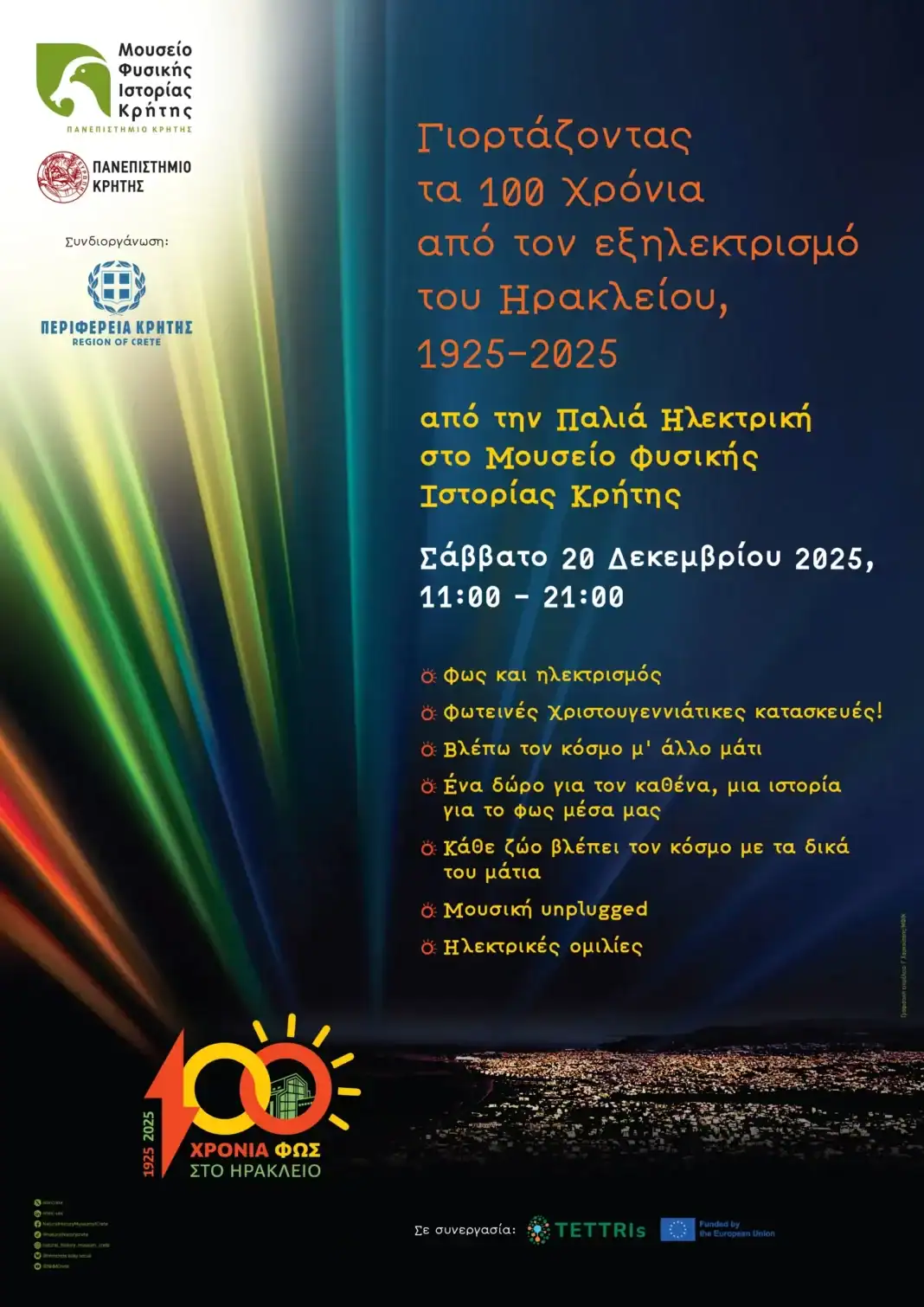 Η Περιφέρεια Κρήτης και ο Σύλλογος Φίλοι του Μουσείου Φυσικής Ιστορίας γιορτάζουν την επέτειο των 100 χρόνων από τον εξηλεκτρισμό της πόλης του Ηρακλείου στο Μουσείο Φυσικής Ιστορίας Κρήτης, το Σάββατο 20 Δεκεμβρίου 2025, από τις 11:00π.μ. το πρωί μέχρι τις 9:00μ.μ. το βράδυ, με ελεύθερη είσοδο.