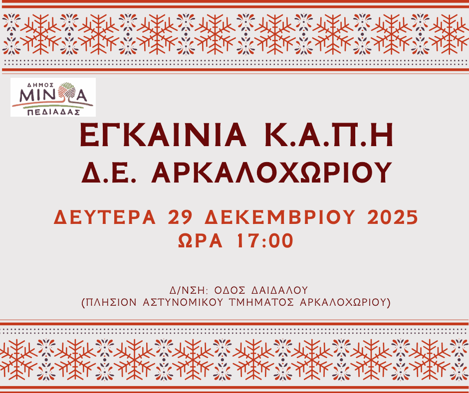 Ο Δήμος Μινώα Πεδιάδας ανακοινώνει ότι τη Δευτέρα 29 Δεκεμβρίου 2025 και ώρα 17:00, θα πραγματοποιηθούν τα εγκαίνια του νέου κτιρίου ΚΑΠΗ Αρκαλοχωρίου.