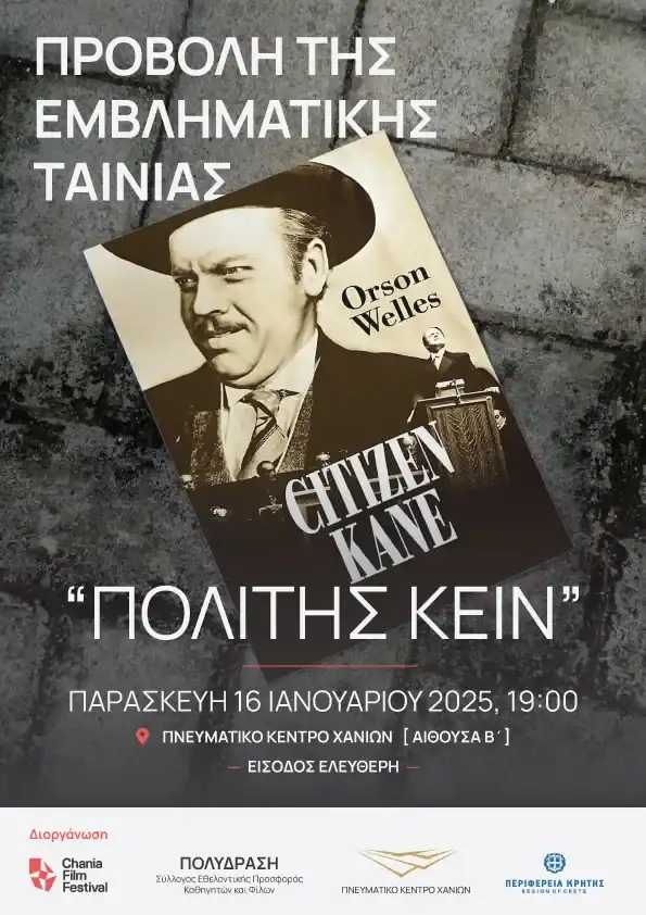 Ο Σύλλογος Εθελοντικής Προσφοράς Καθηγητών και Φίλων «Πολυδράση», σε συνδιοργάνωση με το Φεστιβάλ Κινηματογράφου Χανίων, την Περιφέρεια Κρήτης – Περιφερειακή Ενότητα Χανίων και το Πνευματικό Κέντρο Χανίων, διοργανώνει την προβολή της ταινίας «Πολίτης Κέιν», σε σκηνοθεσία Όρσον Γουέλς, την Παρασκευή 16 Ιανουαρίου 2026, ώρα 19.00, στην αίθουσα του Δ.Σ. του Πνευματικού Κέντρου Χανίων, με ελεύθερη είσοδο.