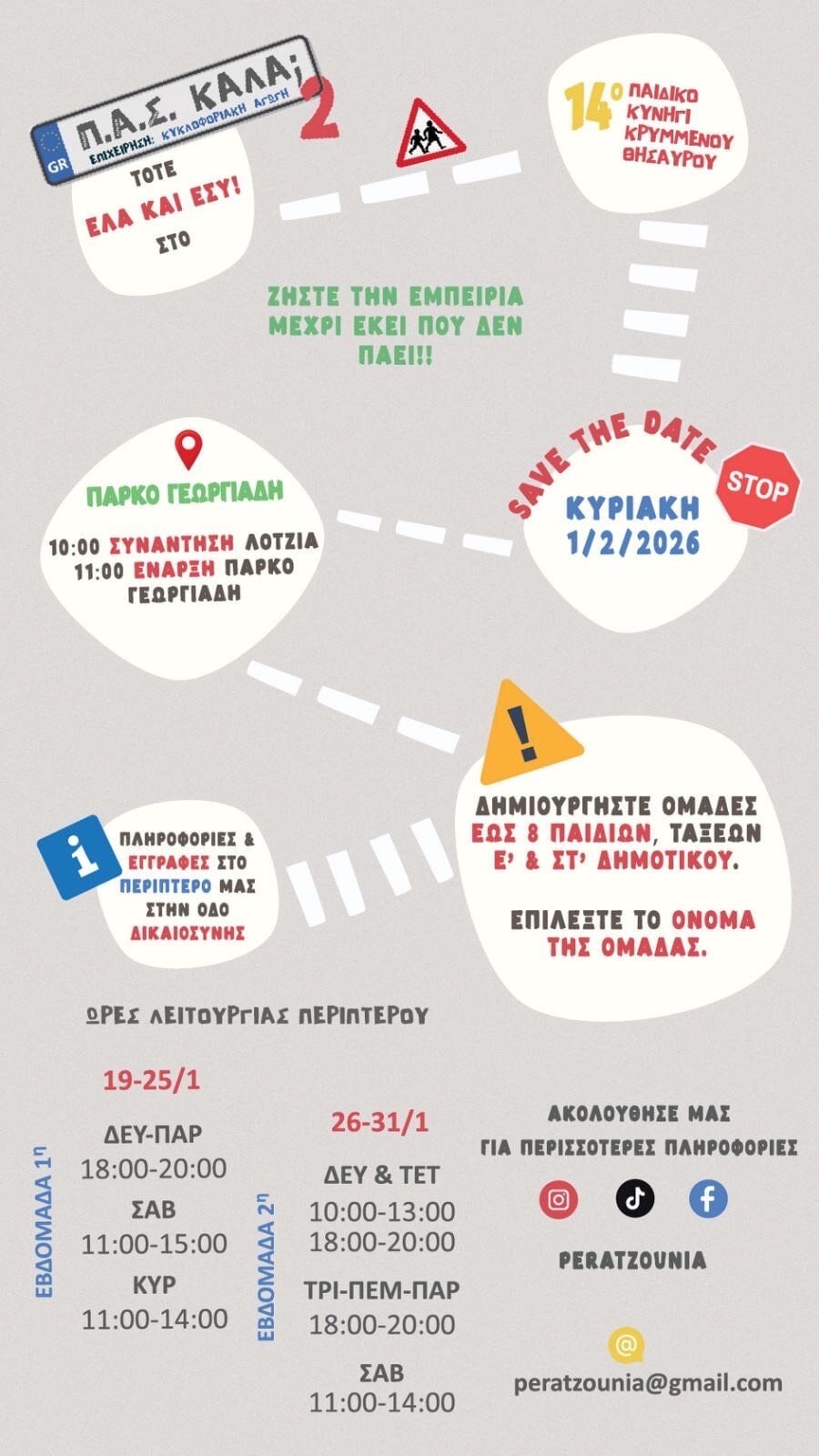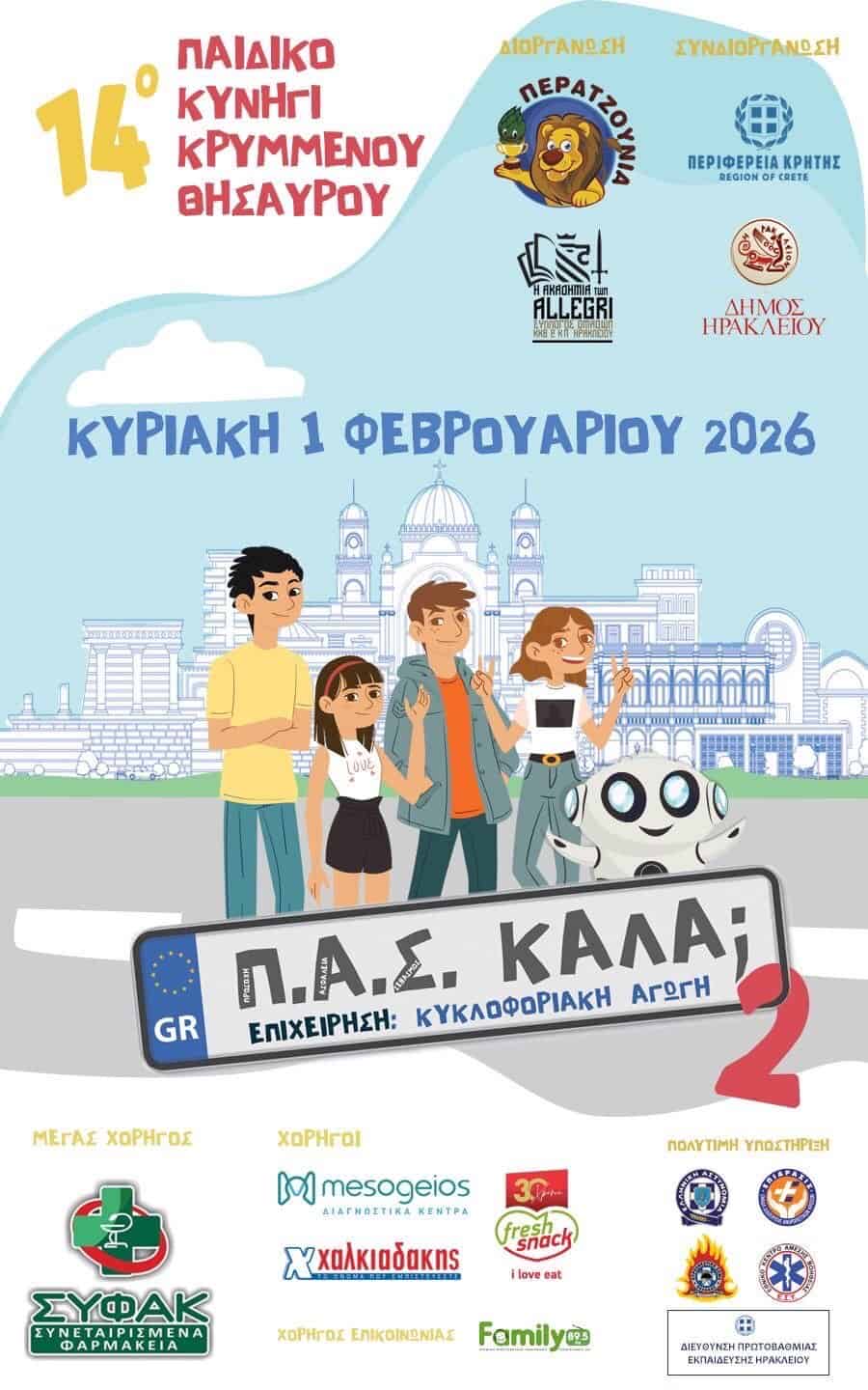 Τον κύκλο των εκδηλώσεων θα ανοίξει το 14ο Παιδικό Κυνήγι Κρυμμένου Θησαυρού την Κυριακή 1 Φεβρουαρίου στο Πάρκο Γεωργιάδη στις 11:00. Φέτος η ομάδα «Περατζούνια» και η Ακαδημία των “ALLEGRI” υπό την αιγίδα του Δήμου Ηρακλείου και την συνδιοργάνωση της Περιφέρειας Κρήτης, καλεί τα παιδιά της Ε’ και ΣΤ’ Δημοτικού στο «Π.Α.Σ. ΚΑΛΑ;»- Επιχείρηση: Κυκλοφοριακή Αγωγή.